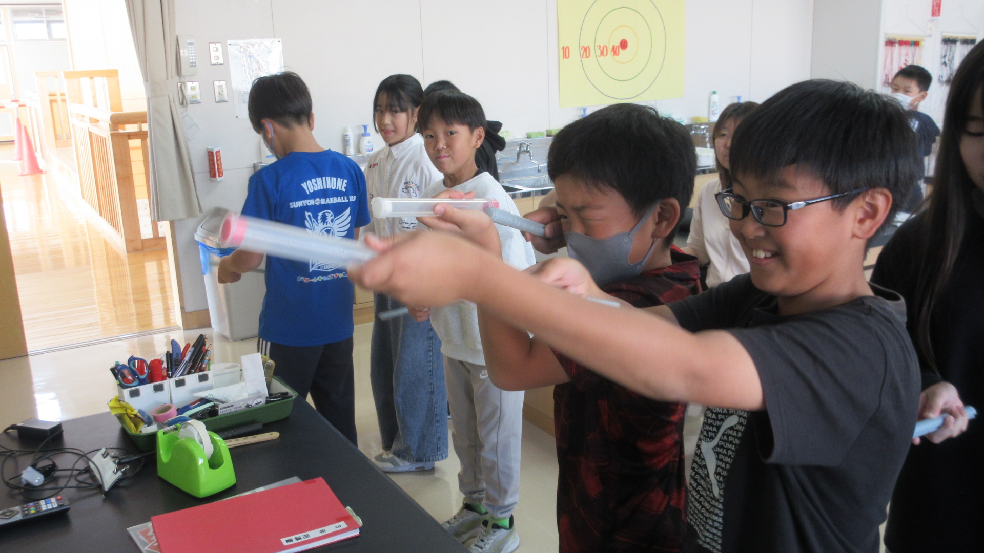 理科室から「ポン!ポン!」という音ともに、子どもたちの歓声が聞こえてきたのでのぞいてみると空気でっぽうで的あてをしていました。
