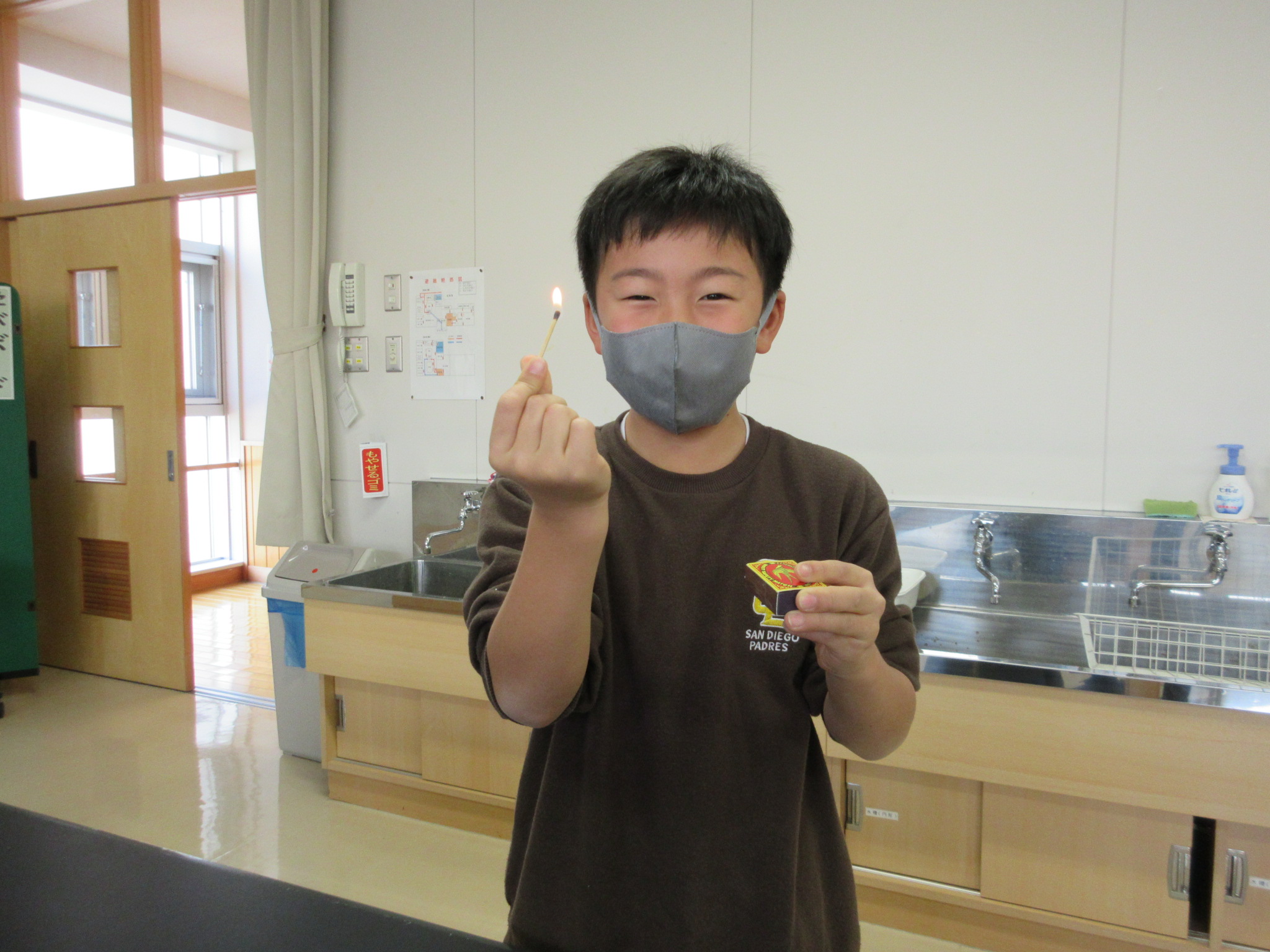 石津先生と気をつける点などを確認し、グループでマッチに火をつける練習をしました。最初うまくつけることができなかった子も、最後はコツをつかんでつけ、日の後始末もしっかりとできました。