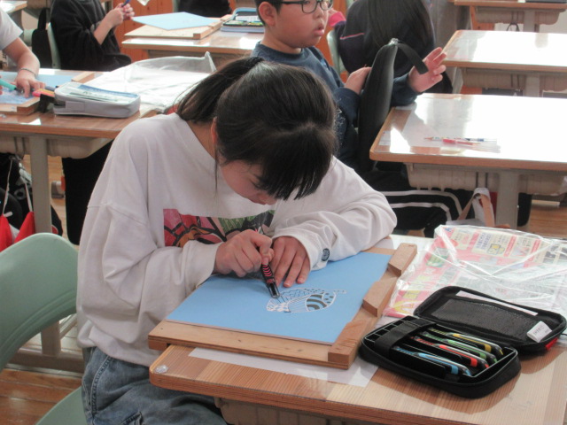 4年生も版画にチャレンジしています。4年生では、彫刻刀を使って木版画に始めてチャレンジです。