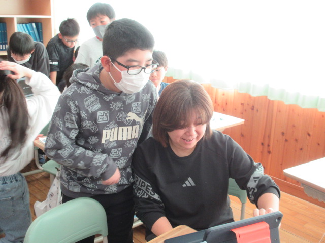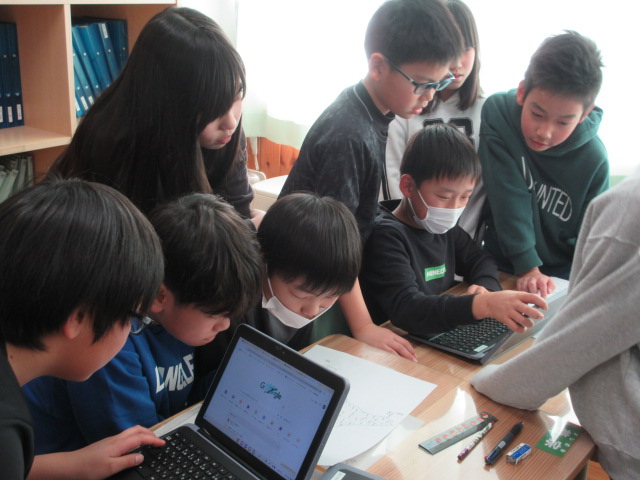 1つの端末に、数人でグループを組んで調べたい町について対話をしています。