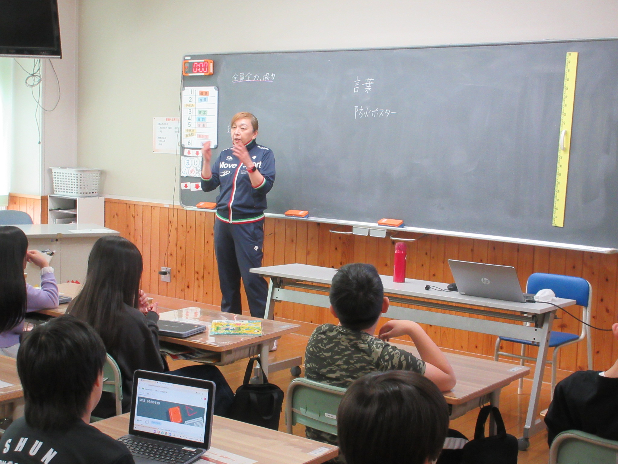 5年生では図工で「防火ポスター」に取り組んでいました。教えているのは6年生の担任の先生です。