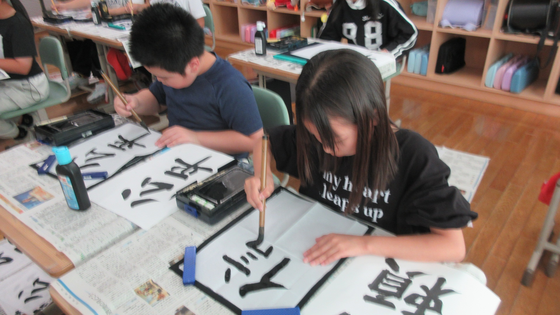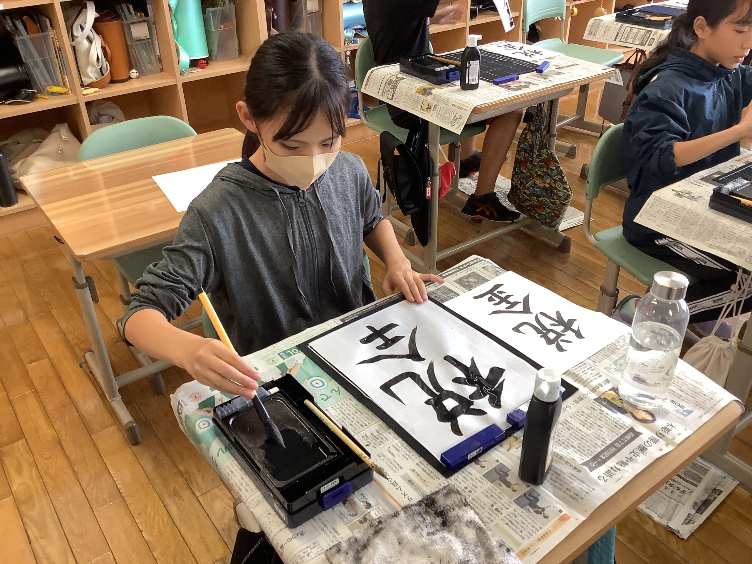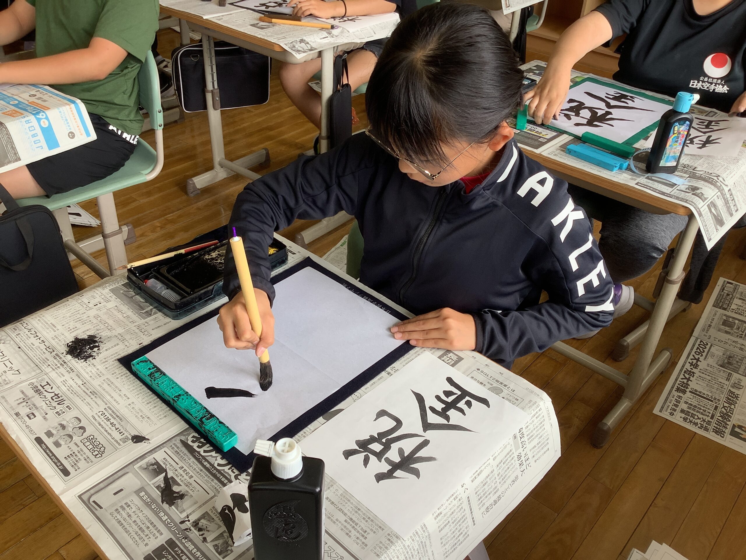 6年生は、全員が同じ「税金」をかきました。どちらの学年も、書に向き合って真剣に字を書いていました。