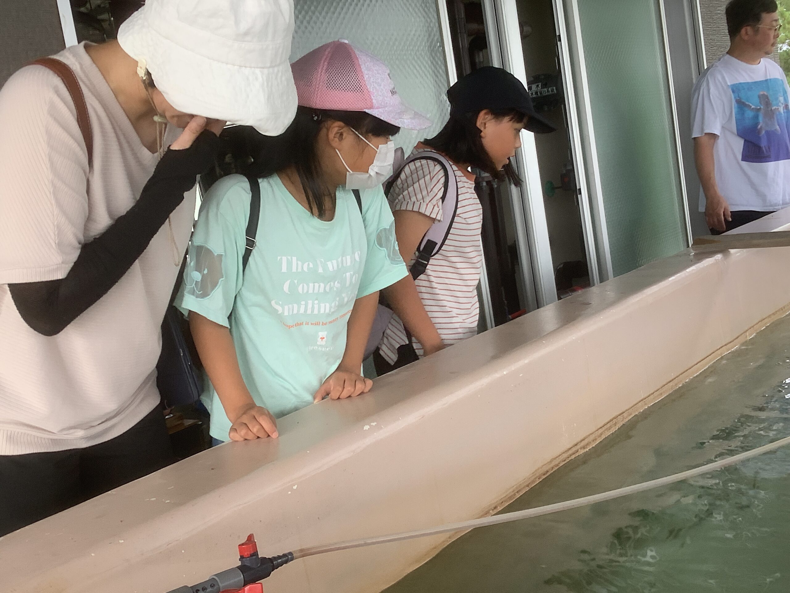 涌元漁港でクロソイの稚魚を放流して、知内町中間育成種苗センターへ移動してクロソイの赤ちゃんを見ました。