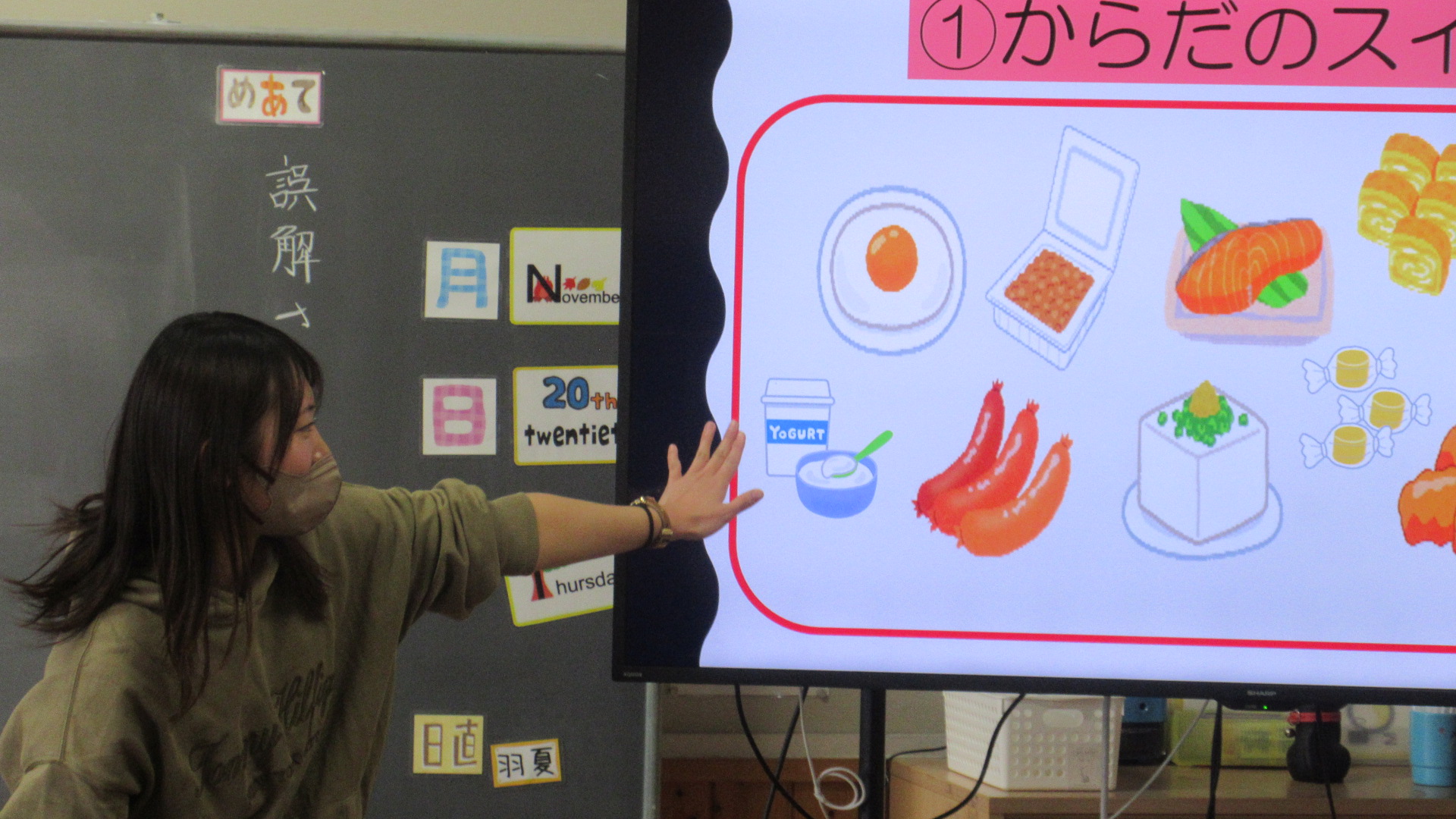 「あたまスイッチ」(炭水化物)「からだスイッチ」(タンパク質)「おなかスイッチ」(ビタミン)について学び、それぞれどのような食材が当てはまるのかを学びました。