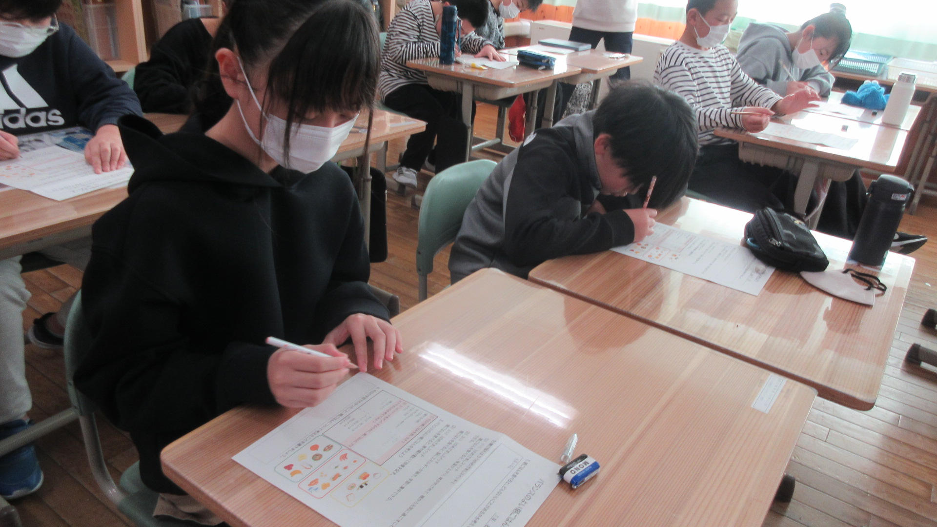 次に、バランスよく食べているか考えました。「あっ、緑の食べ物が少ない。」など自分の気づきを書き込んでいました。