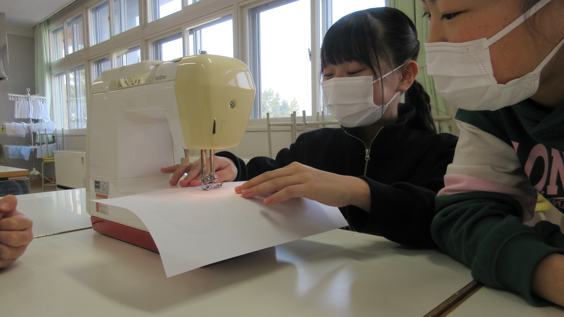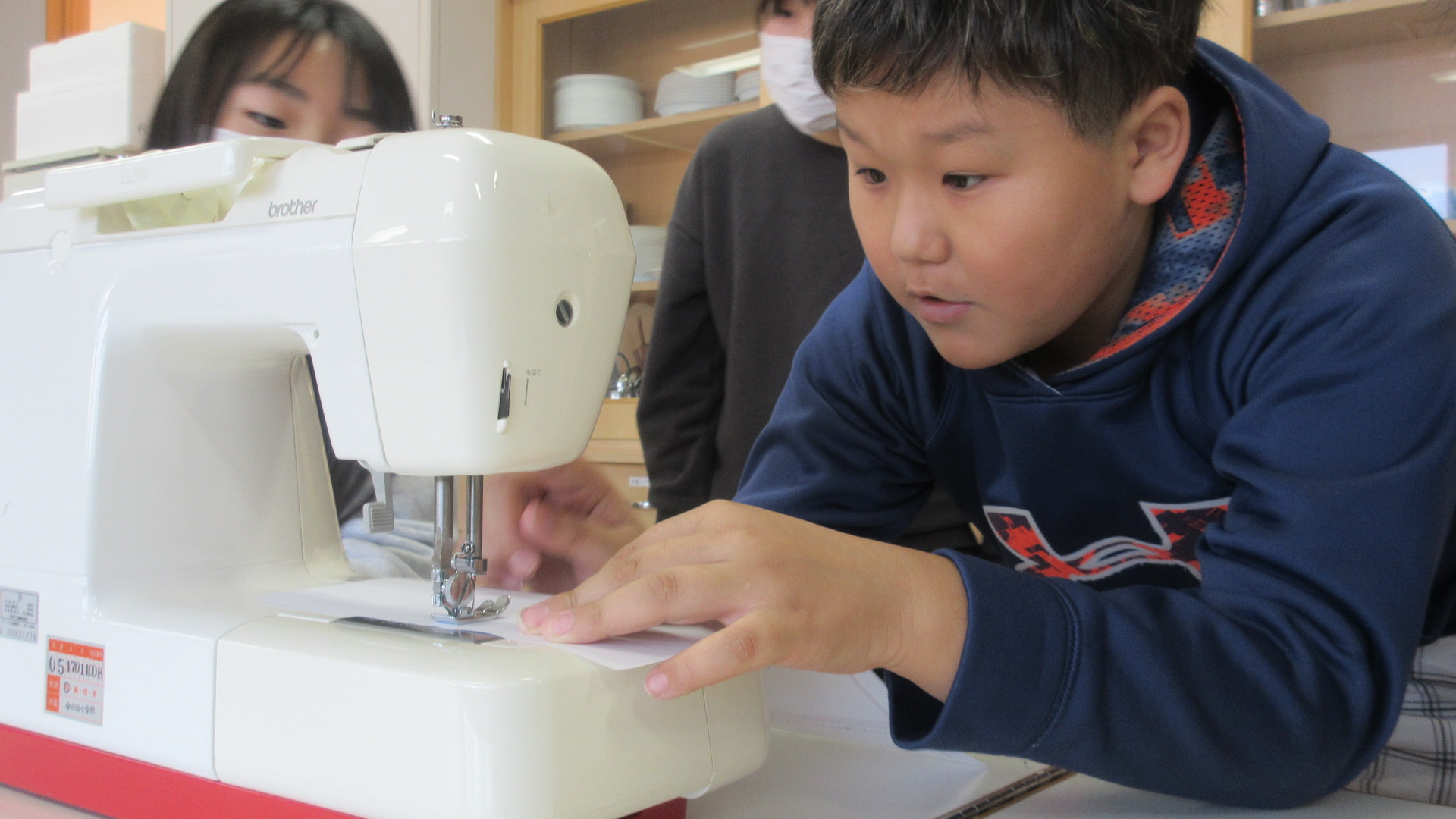 5年生が、家庭科の「ミシンで楽しくソーイング」で、はじめてのミシンにチャレンジしていました。