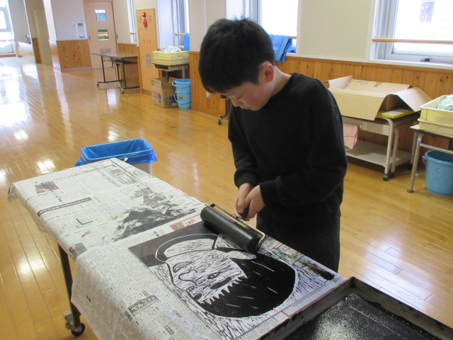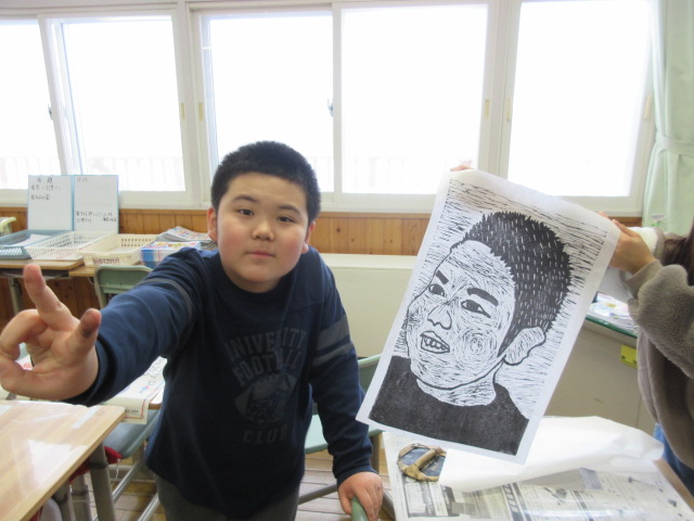 5年生が制作している版画(自画像)が大詰めを迎えています。堀が遅れていた子も、冬休み中にがんばってきました。
