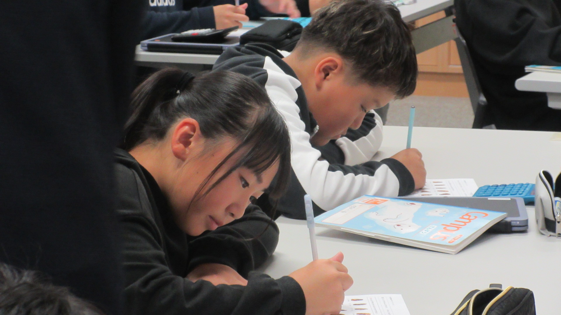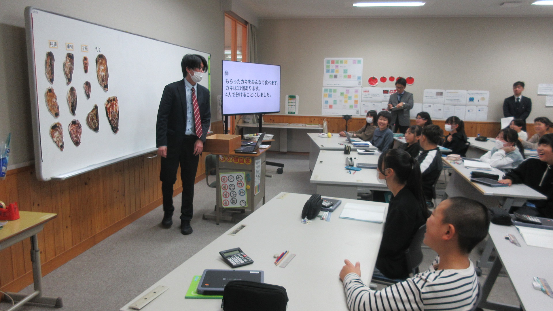 5年生の「平均」の学習で、松本先生はより算数が身近なところで使われていることを子どもたちに気づかせるために、知内町の特産の「かき」を題材に授業をしました。