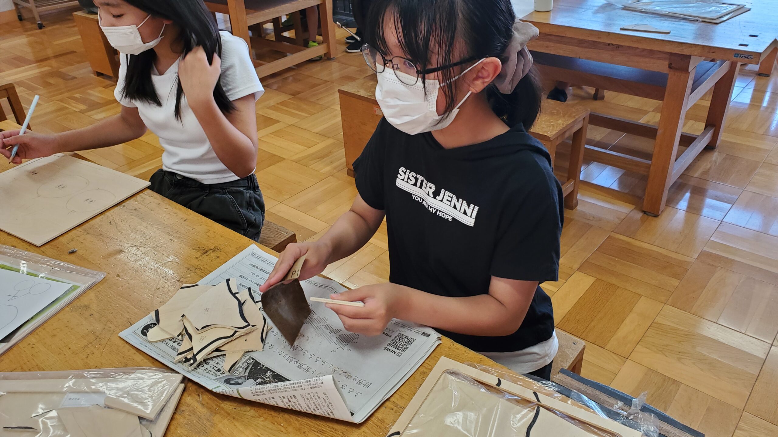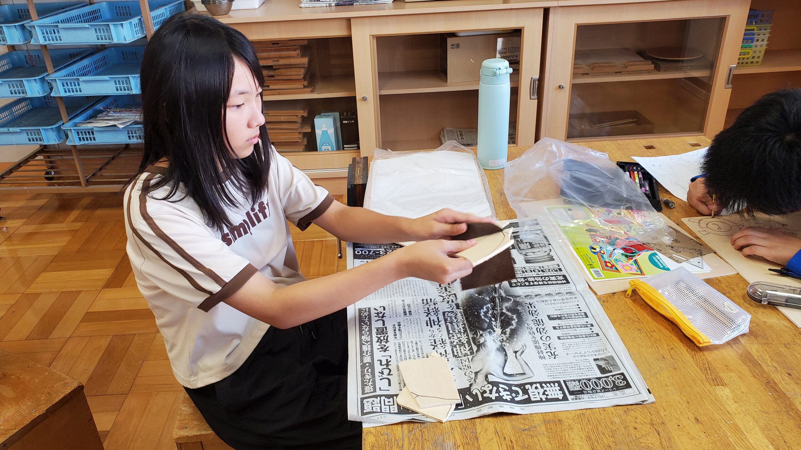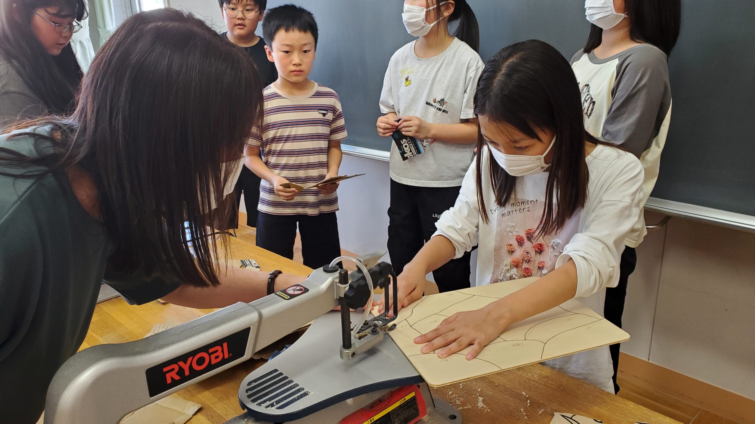 5年生が図工で「糸のこすいすい」の学習をしています。1枚の板を切って、パズルにする学習です。