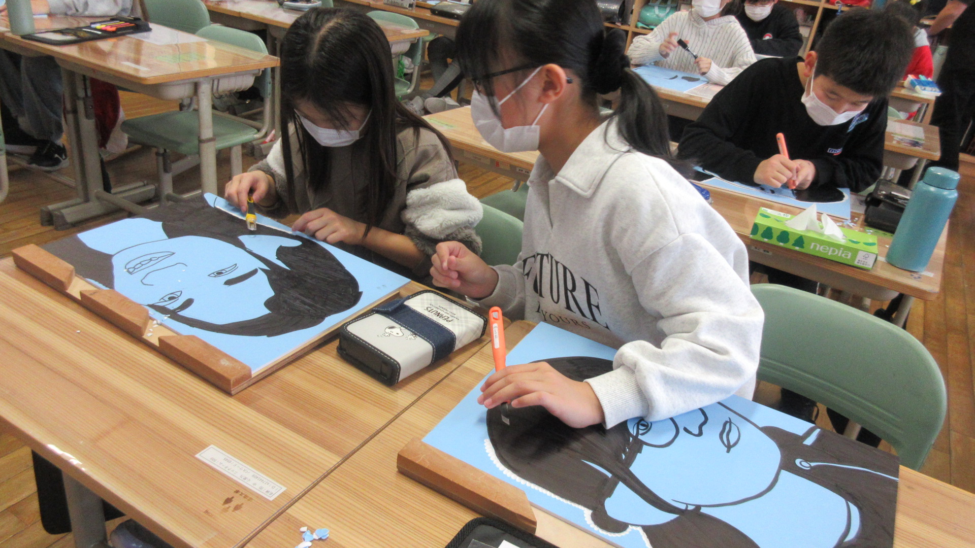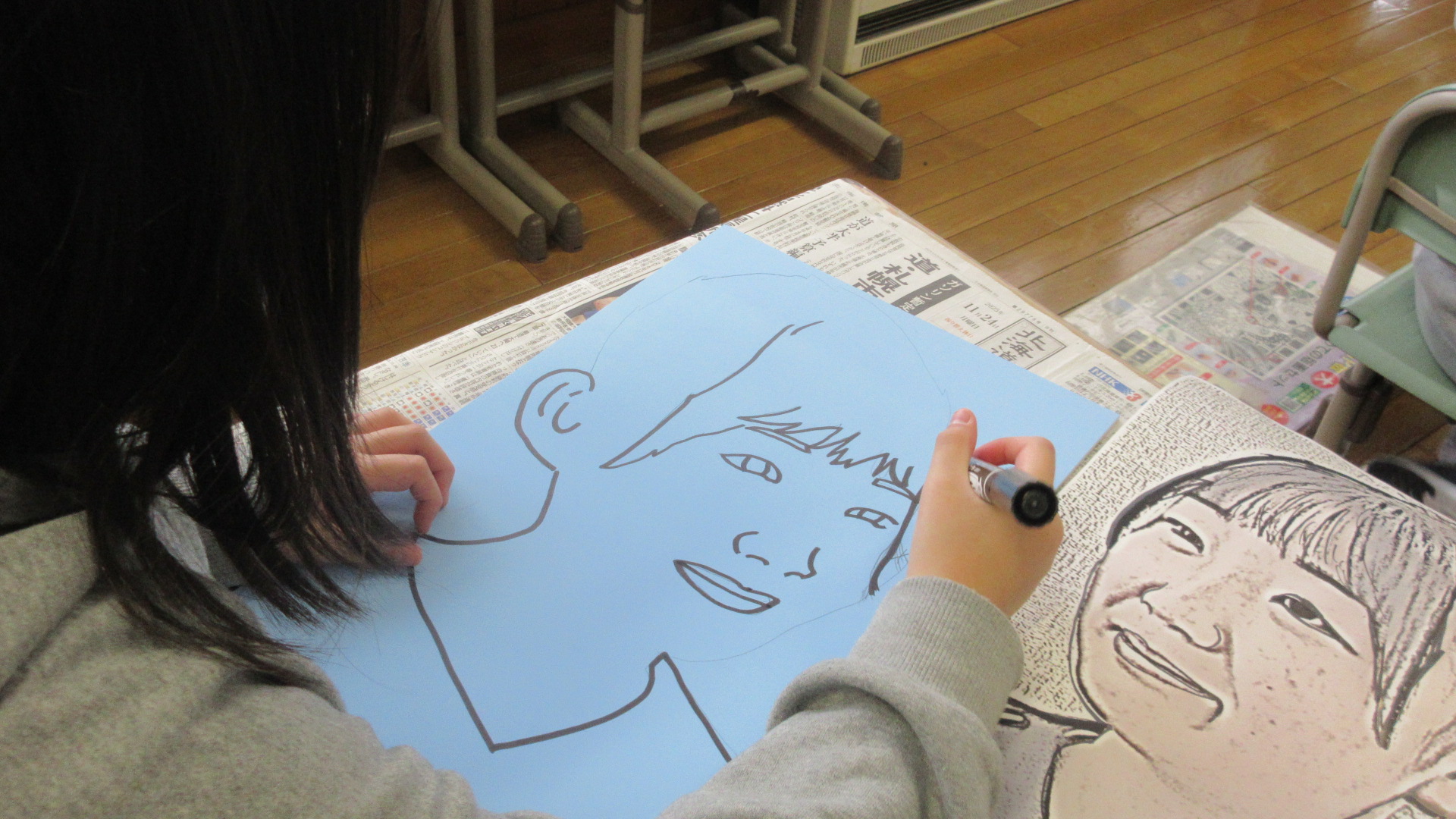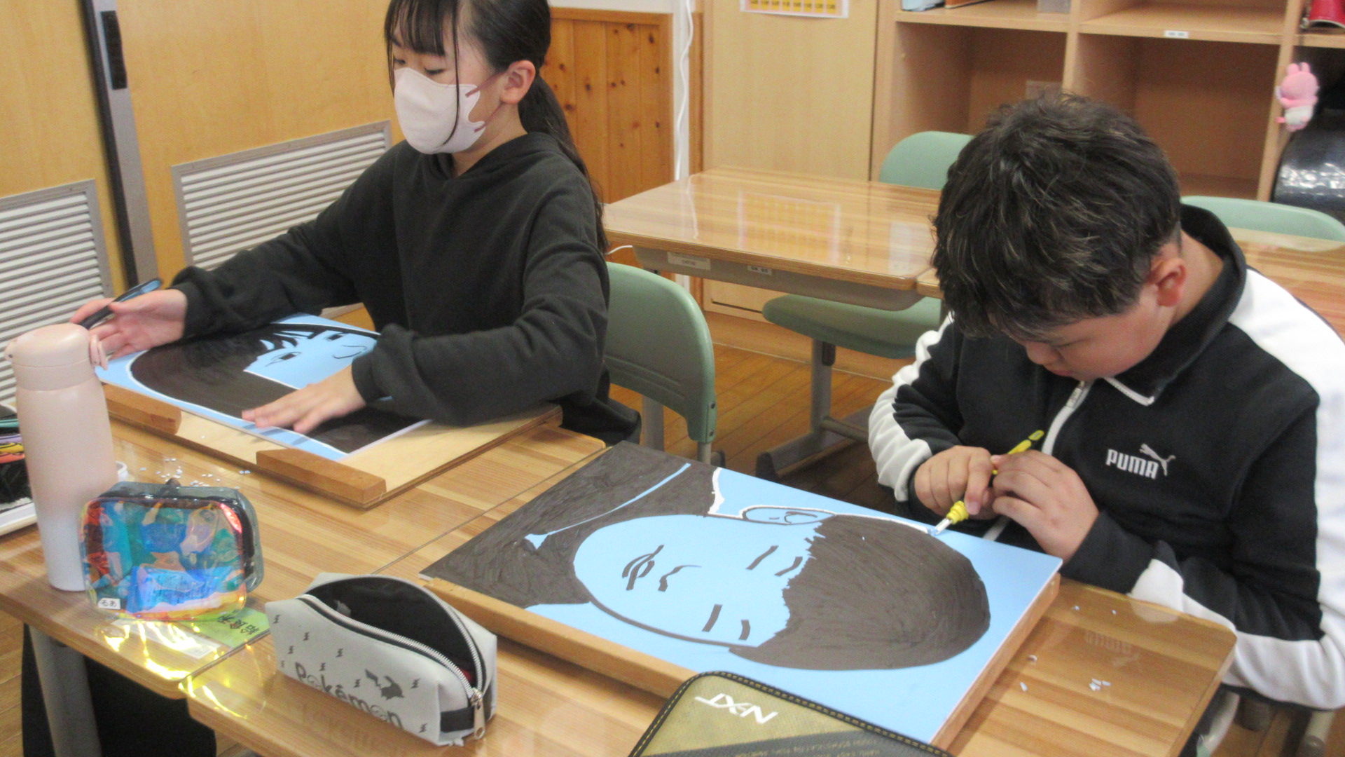 5年生が木版画で「自分の顔」を制作しています。自分の顔写真から下絵を作り、それをカーボン紙で版木に写します。