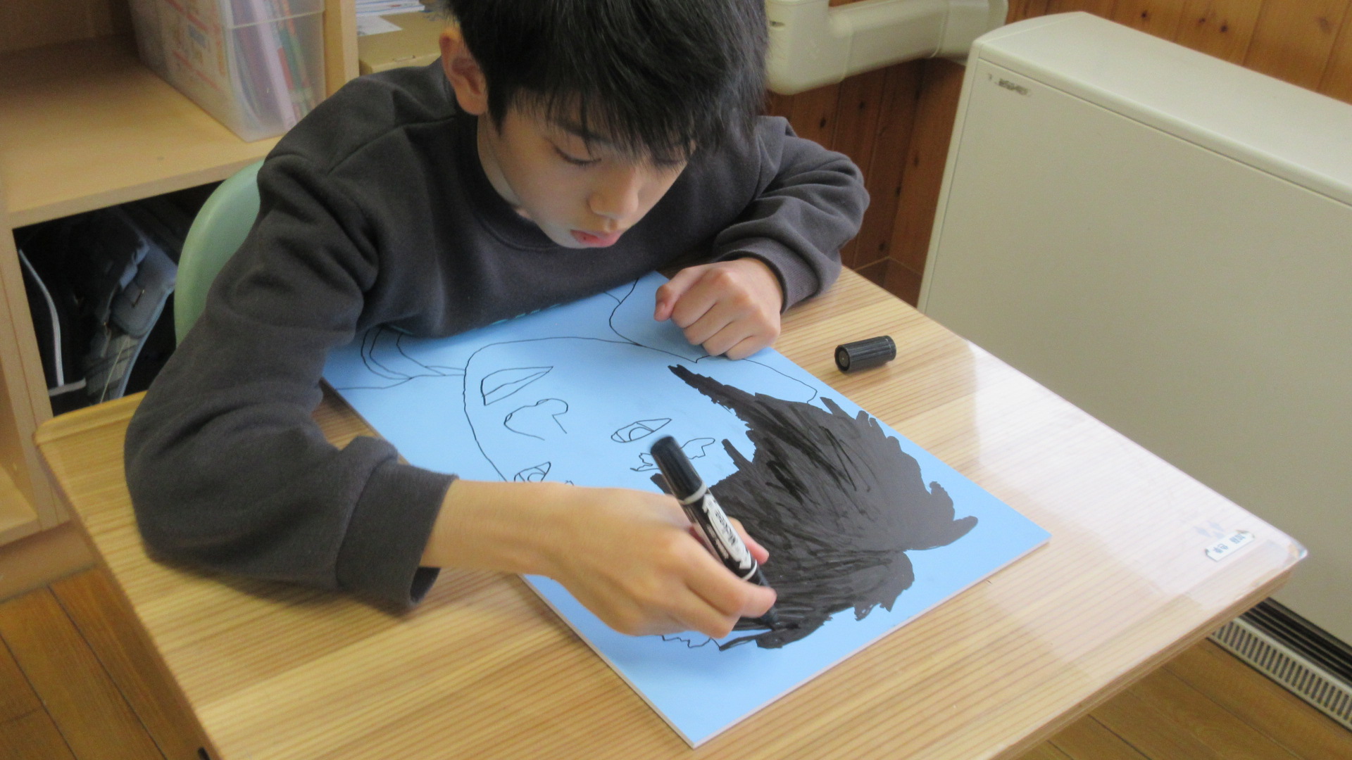 髪の毛は黒いから、マジックで全部黒くします。結構大変な作業ですが、黙々と取り組んでいます。