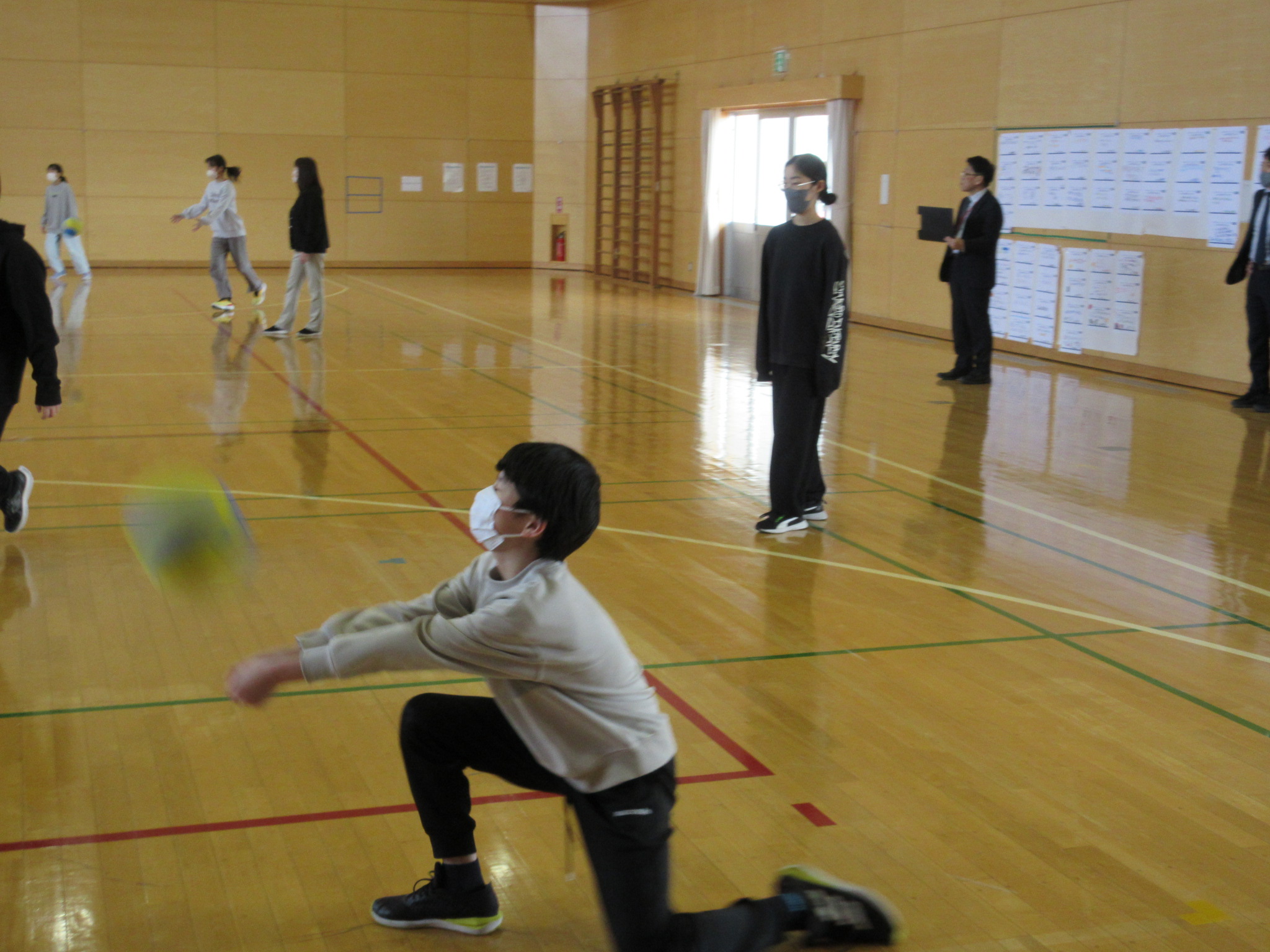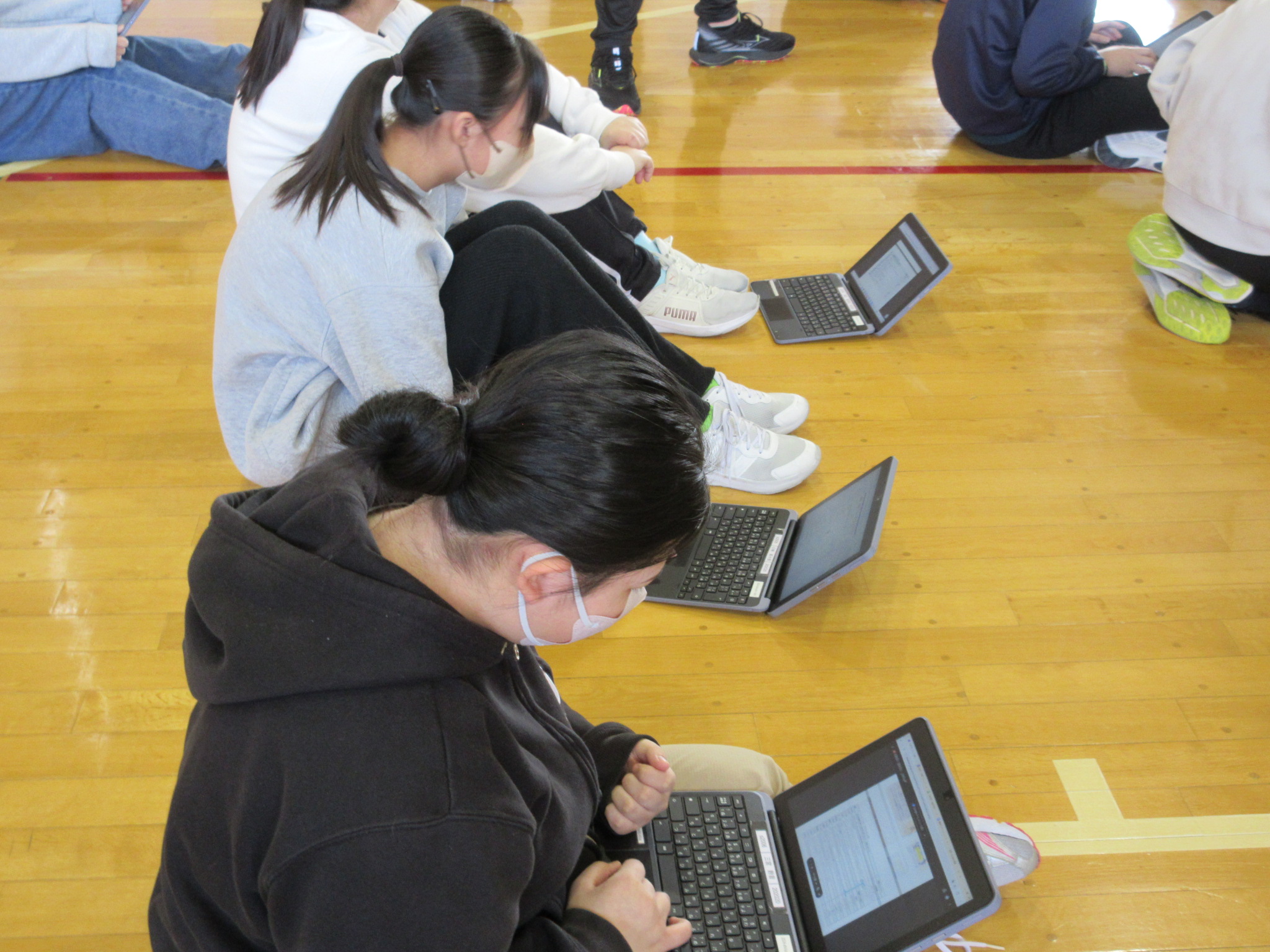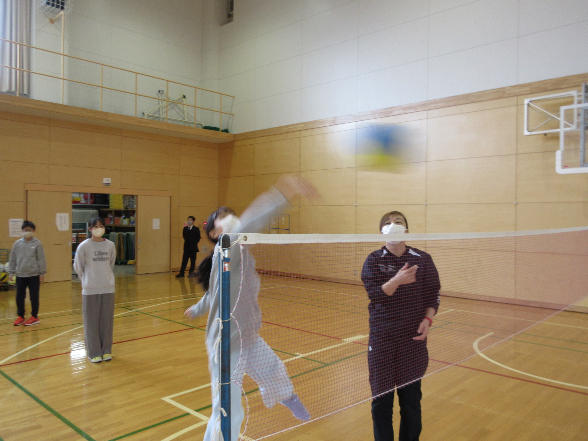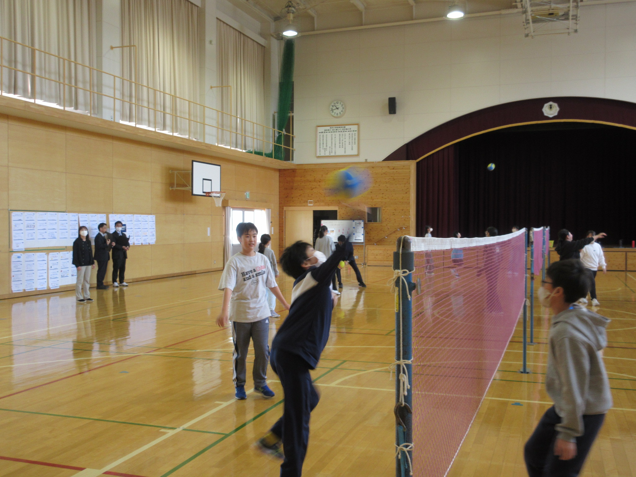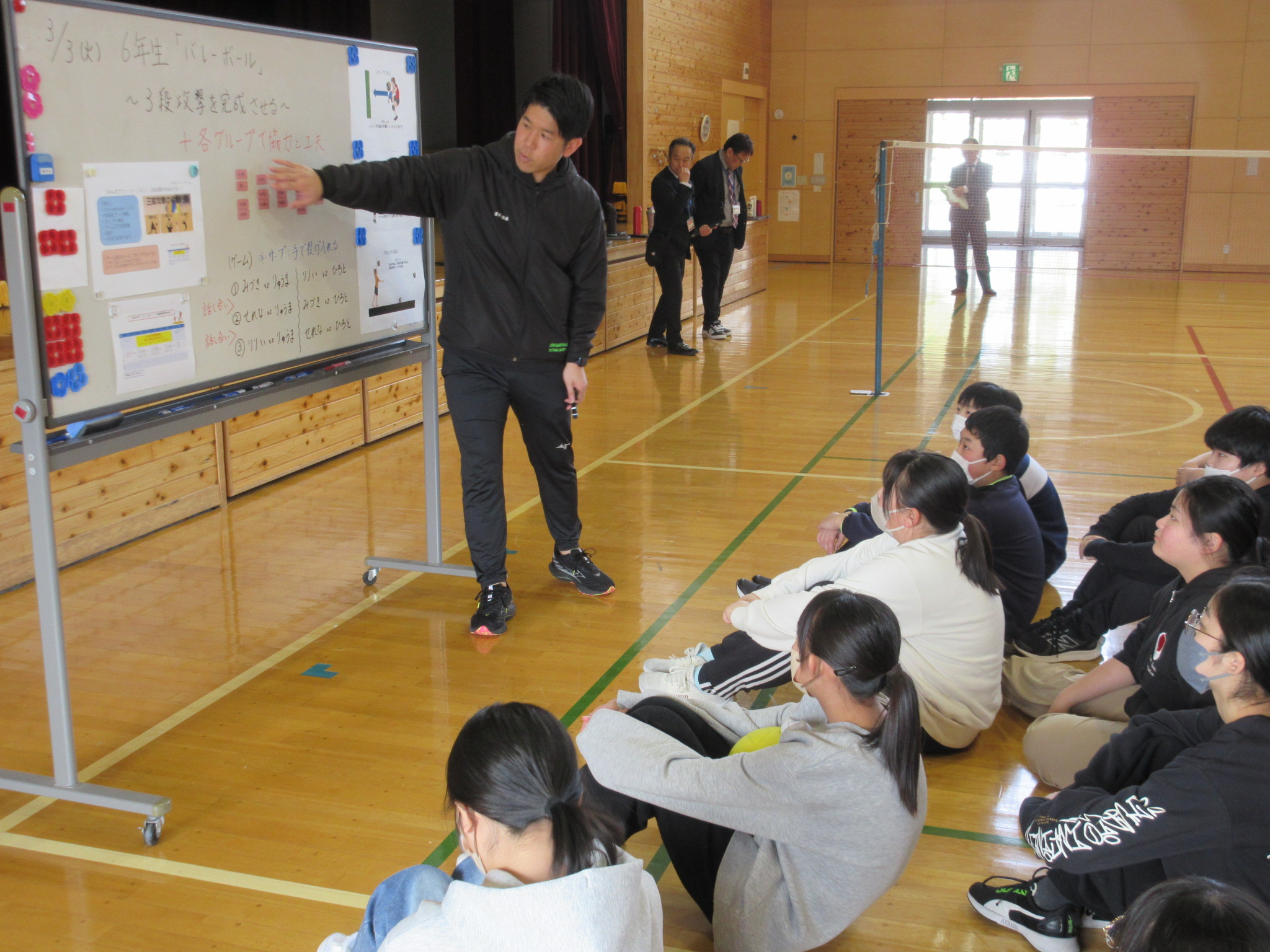 6年生は体育で「バレーボール」の学習をしています。この授業には、渡島教育局義務教育指導監と指導主事も参観されました。授業最初に、今日学習することを端末を使って確認をしました。めあては「3段攻撃ができるようになる」です。