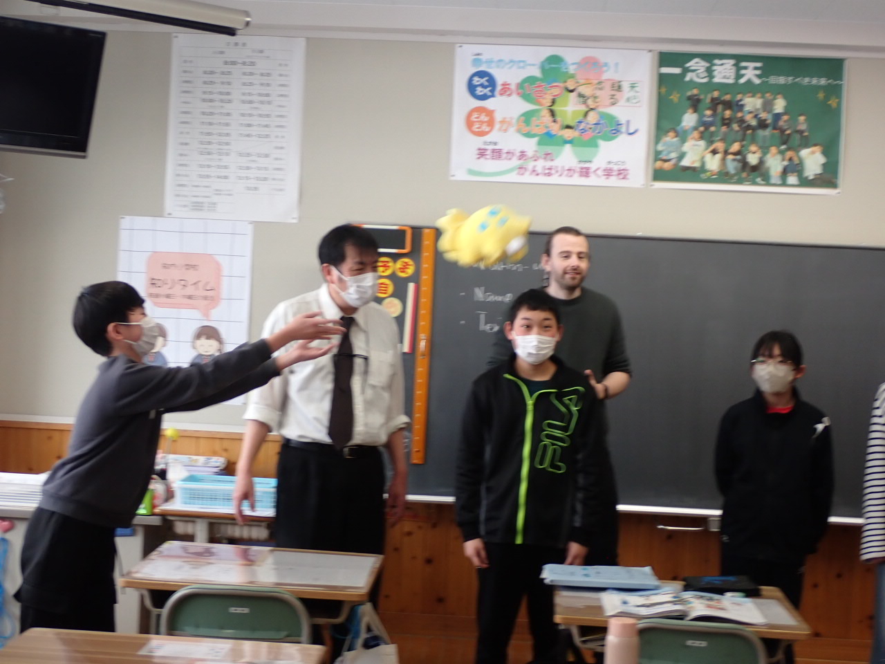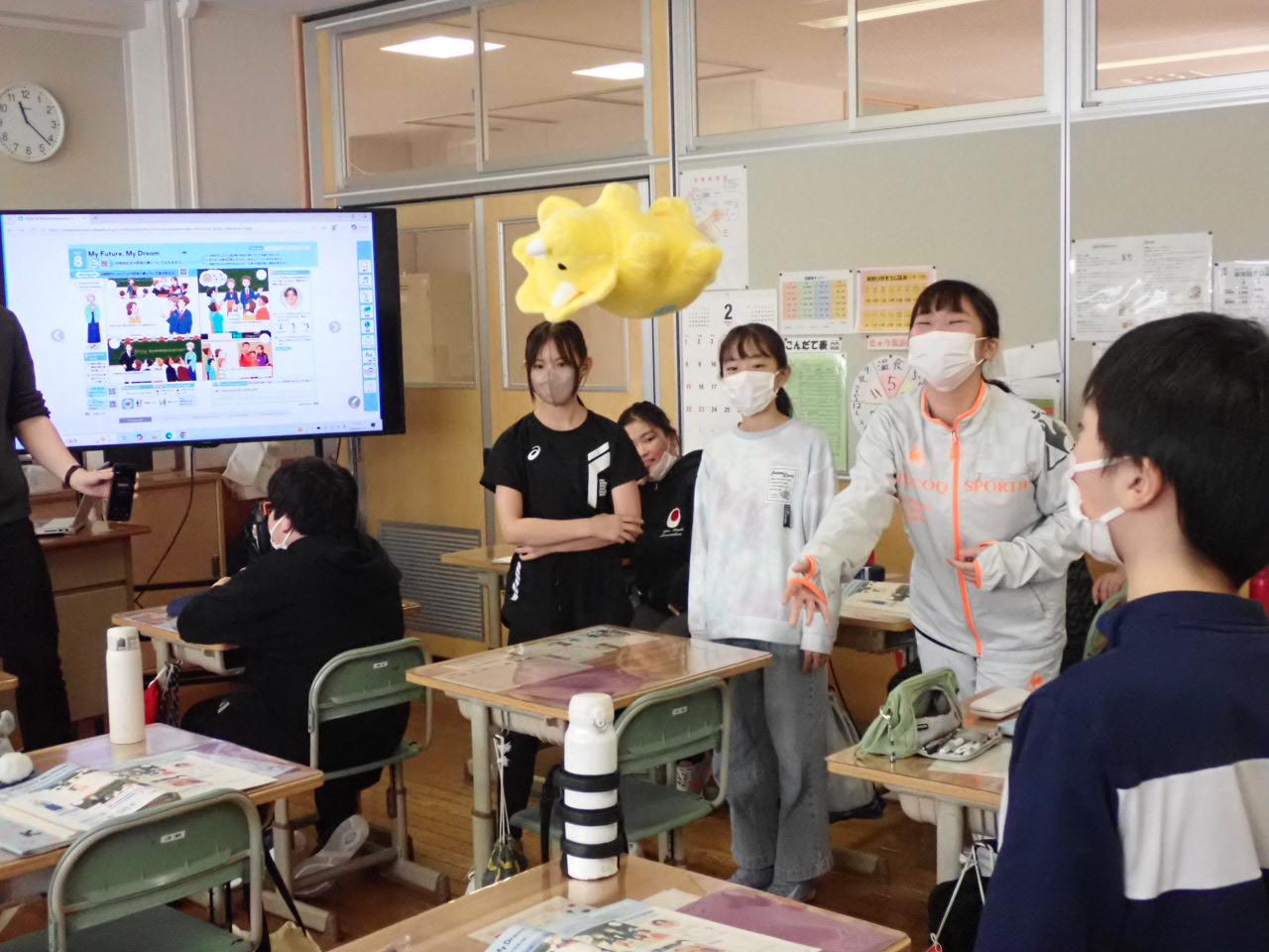 みんなで輪になり、指定された英単語を発音して次の人へぬいぐるみを投げるアクティビティーです。たのしそう!