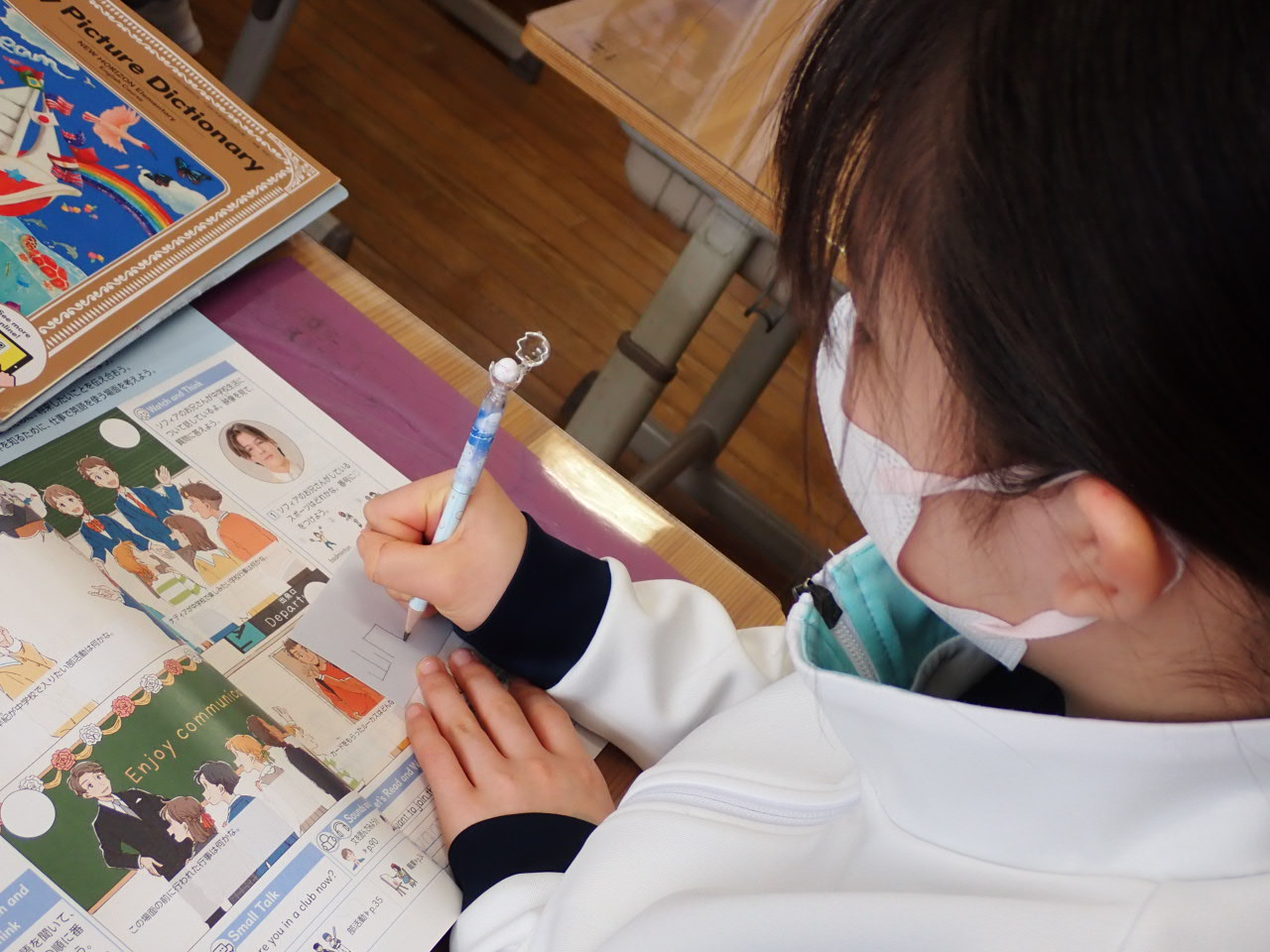 最後は身振り手振りで歌にしてメインフレーズを学びました。ちょっといつもと違って恥ずかしかったかな?次はお互いリラックスして授業できますね!