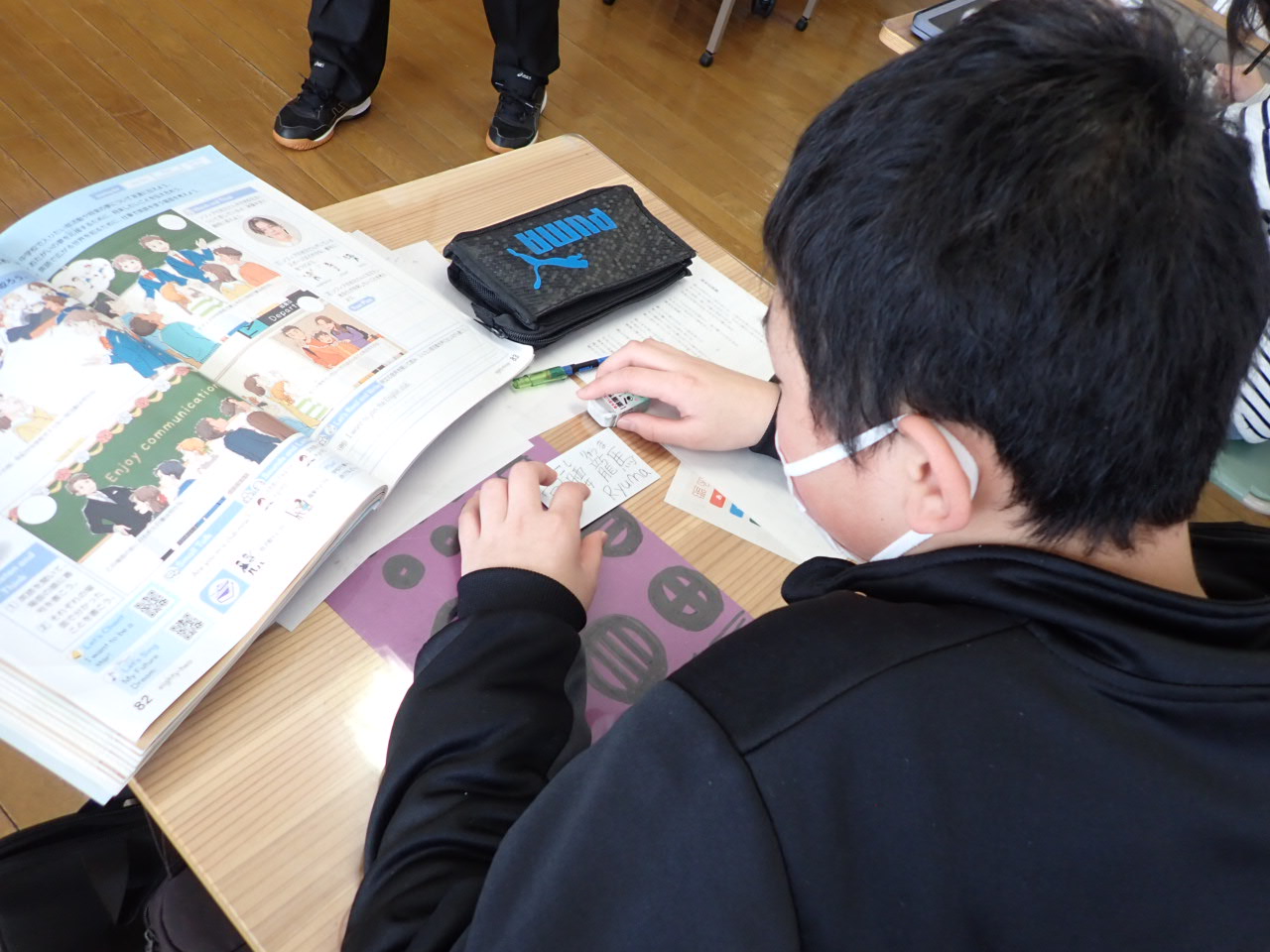 佐藤先生とお互いに仲良くなるため、名前カードを書いています。名前以外でも好きなもの書いてね~