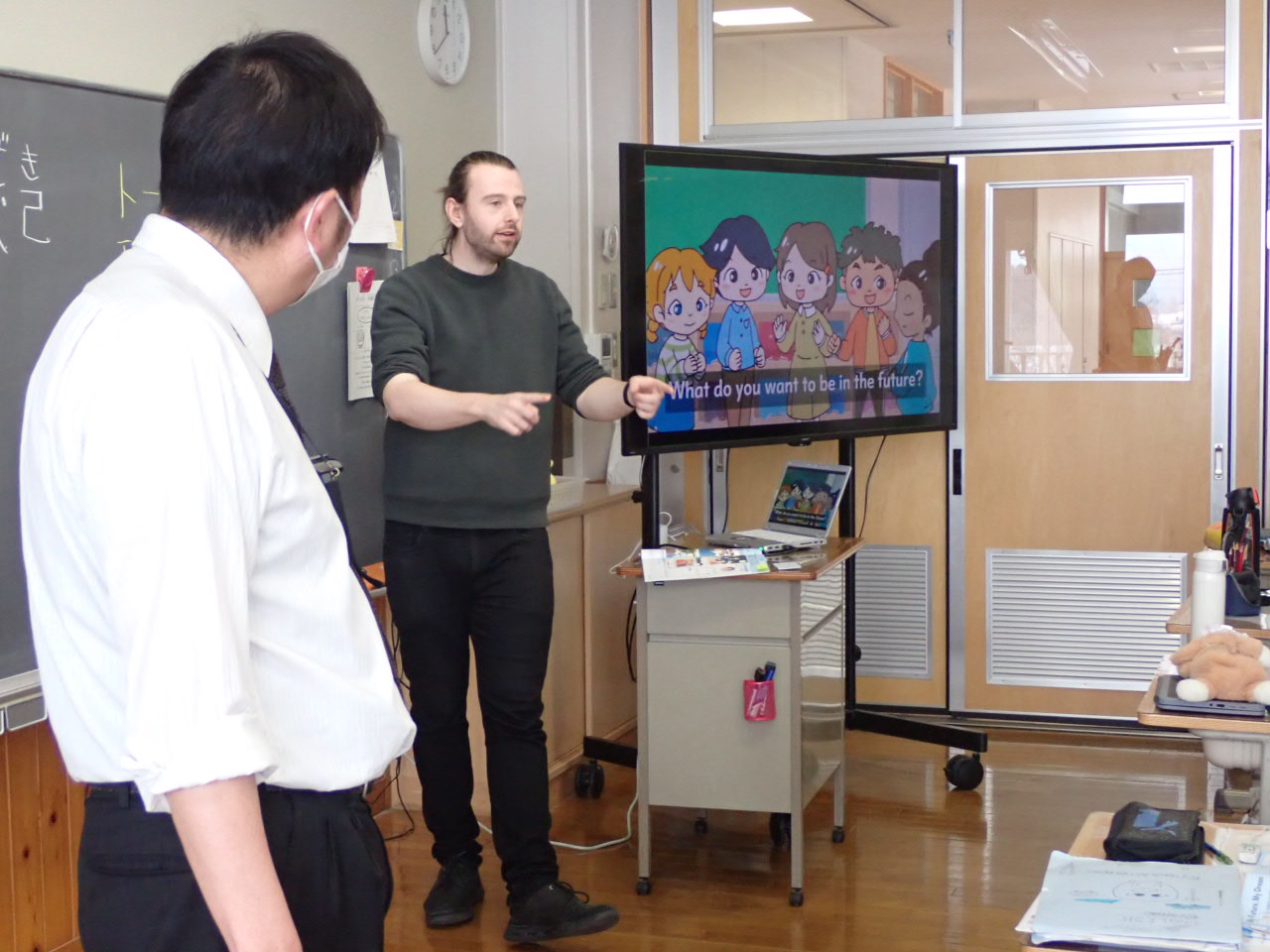 What do you want to be in the future? みんなは将来何になりたい? のメインフレーズを佐藤先生、トーマスと一緒に発音しています。