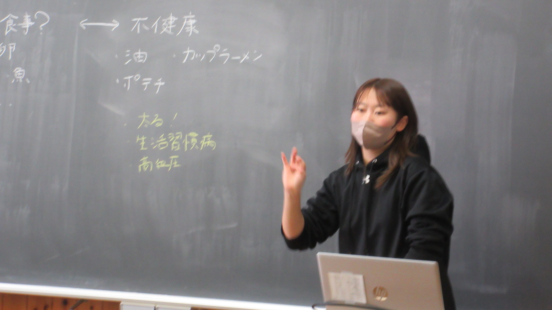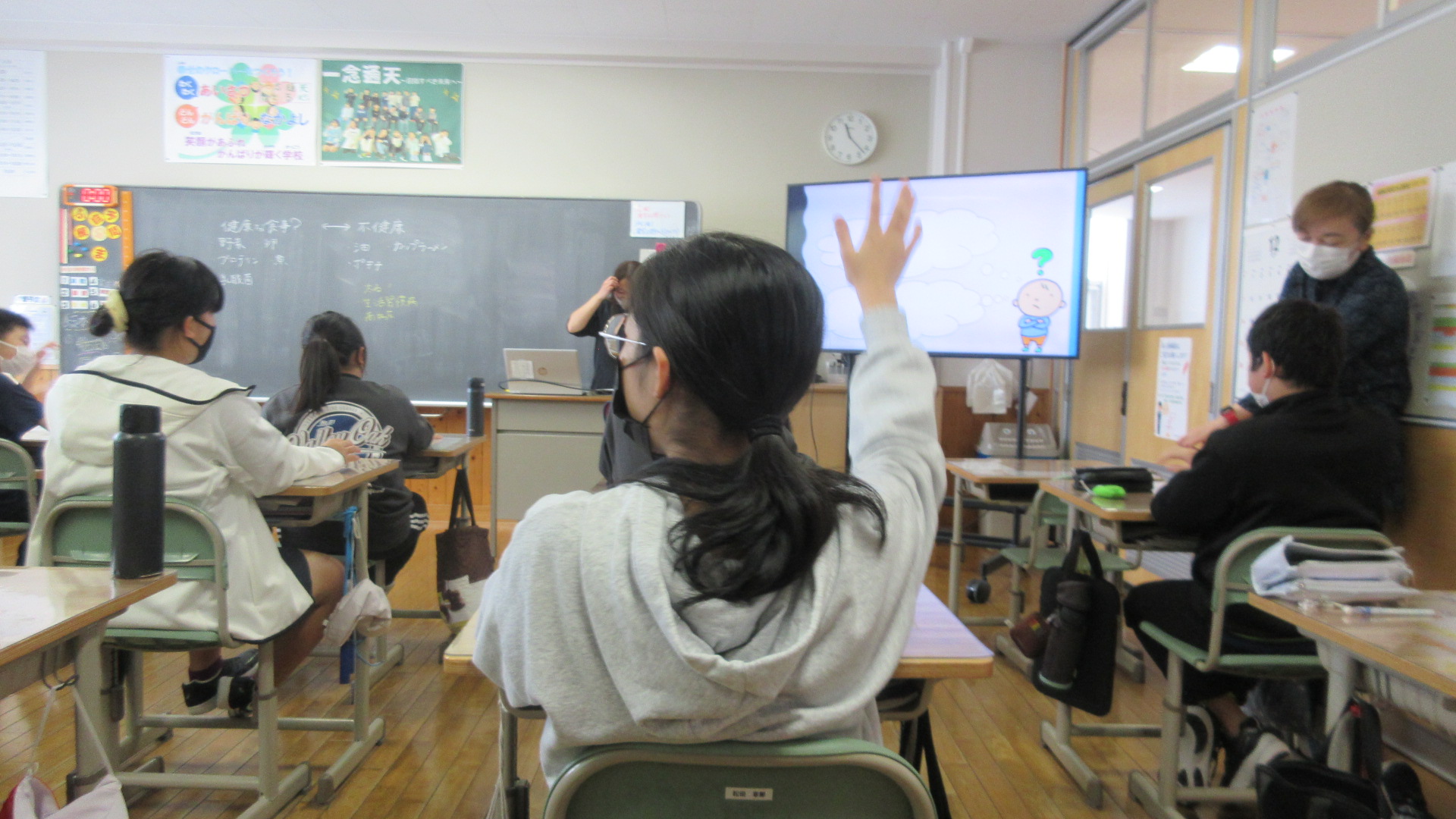 まずは、「健康な食べ物と不健康な食べ物」について考えました。健康では、「野菜・卵・魚・乳酸菌・・・」不健康では、「油・カップラーメン・ポテチ・・・」が出ました。