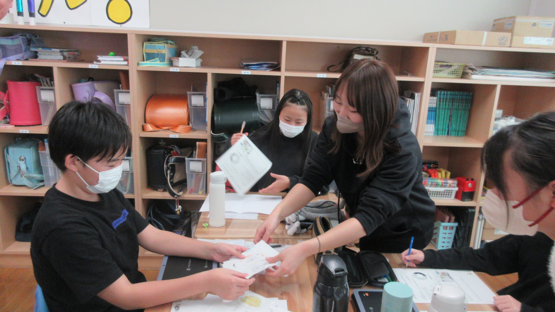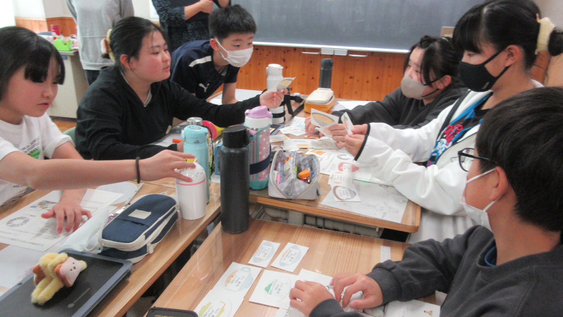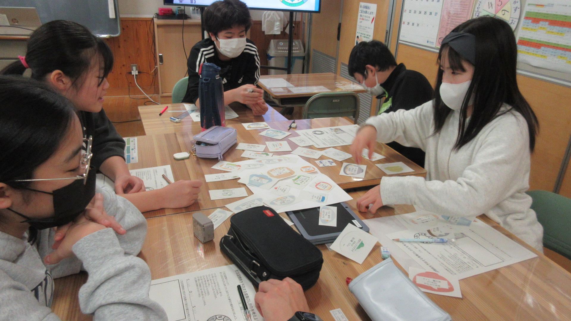 「健康的な食事とはどんなメニュー?」にたいして、4つのグループになって考えました。たくさんの料理が書かれたカードから、友達と相談し・協力し・考えてまとめました。