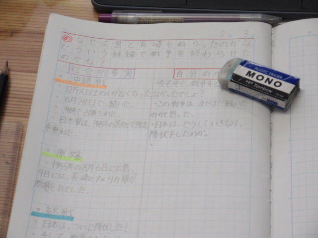 今日は、第二次世界大戦の沖縄戦について深く学びました。このあと、終戦について学んでいきます。長かった歴史もあと少しです。