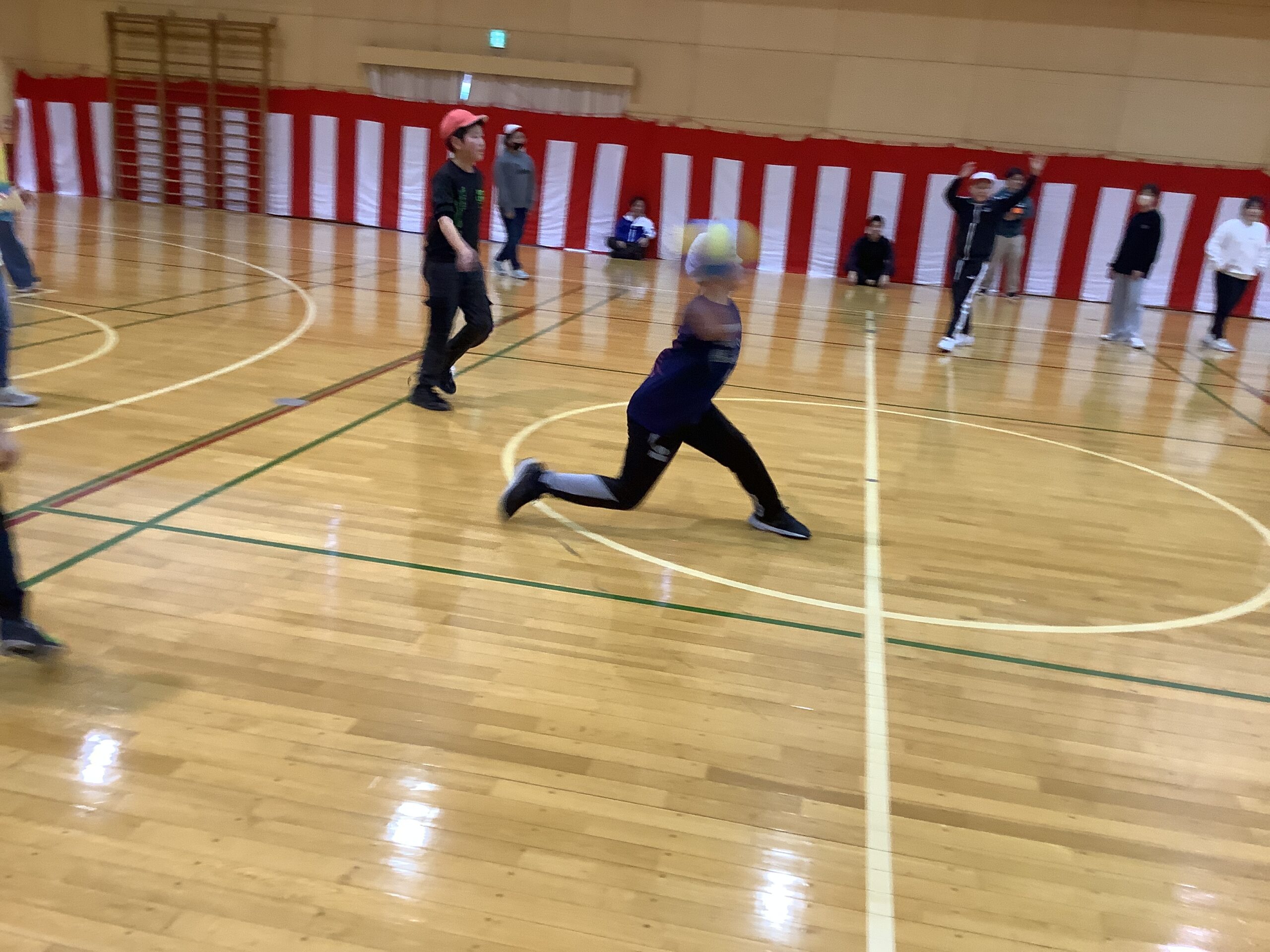 それでも、ぶつからずに、みんな楽しく鬼ごっこができました。次に、ドッジボールを行いました。
