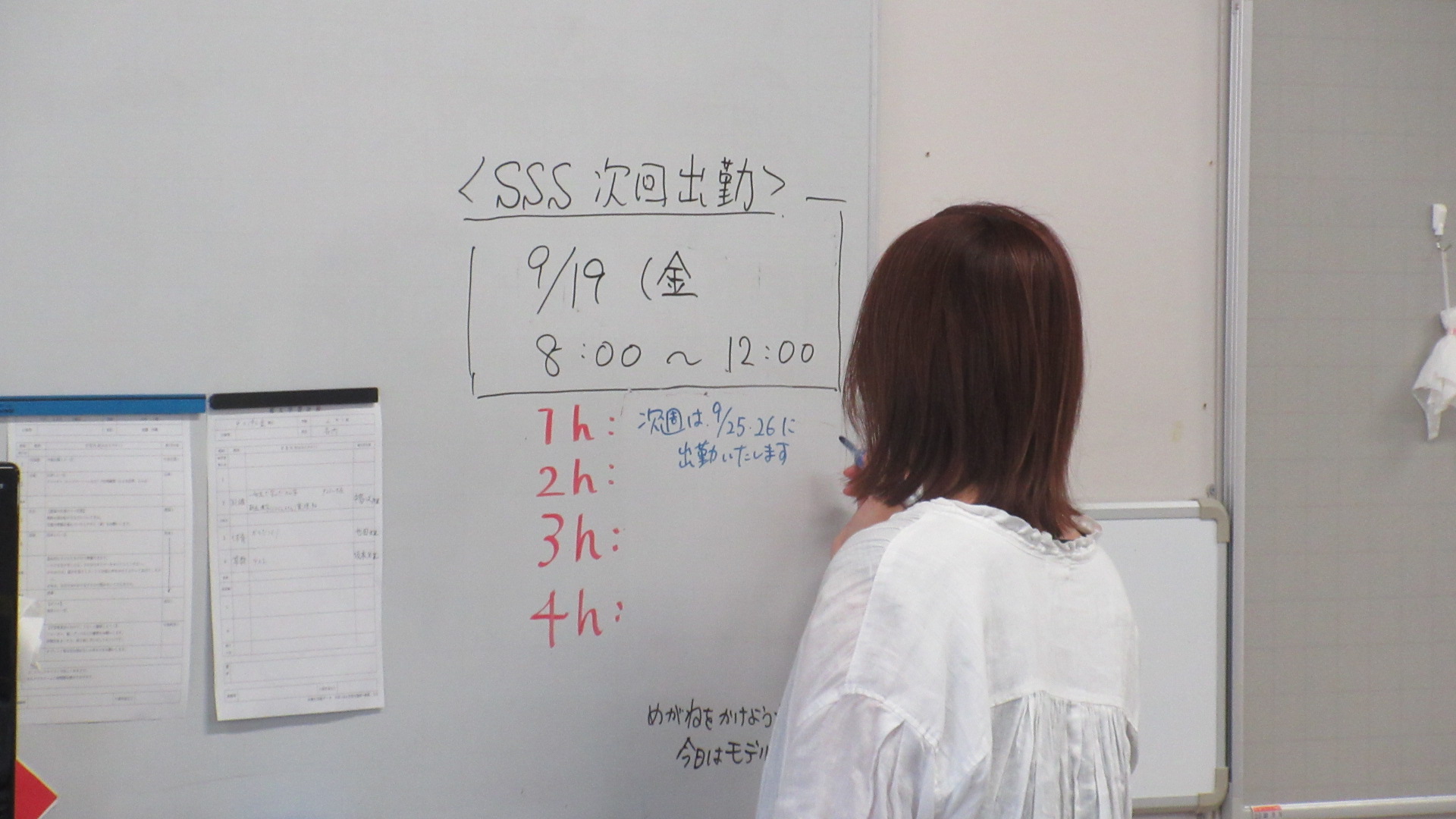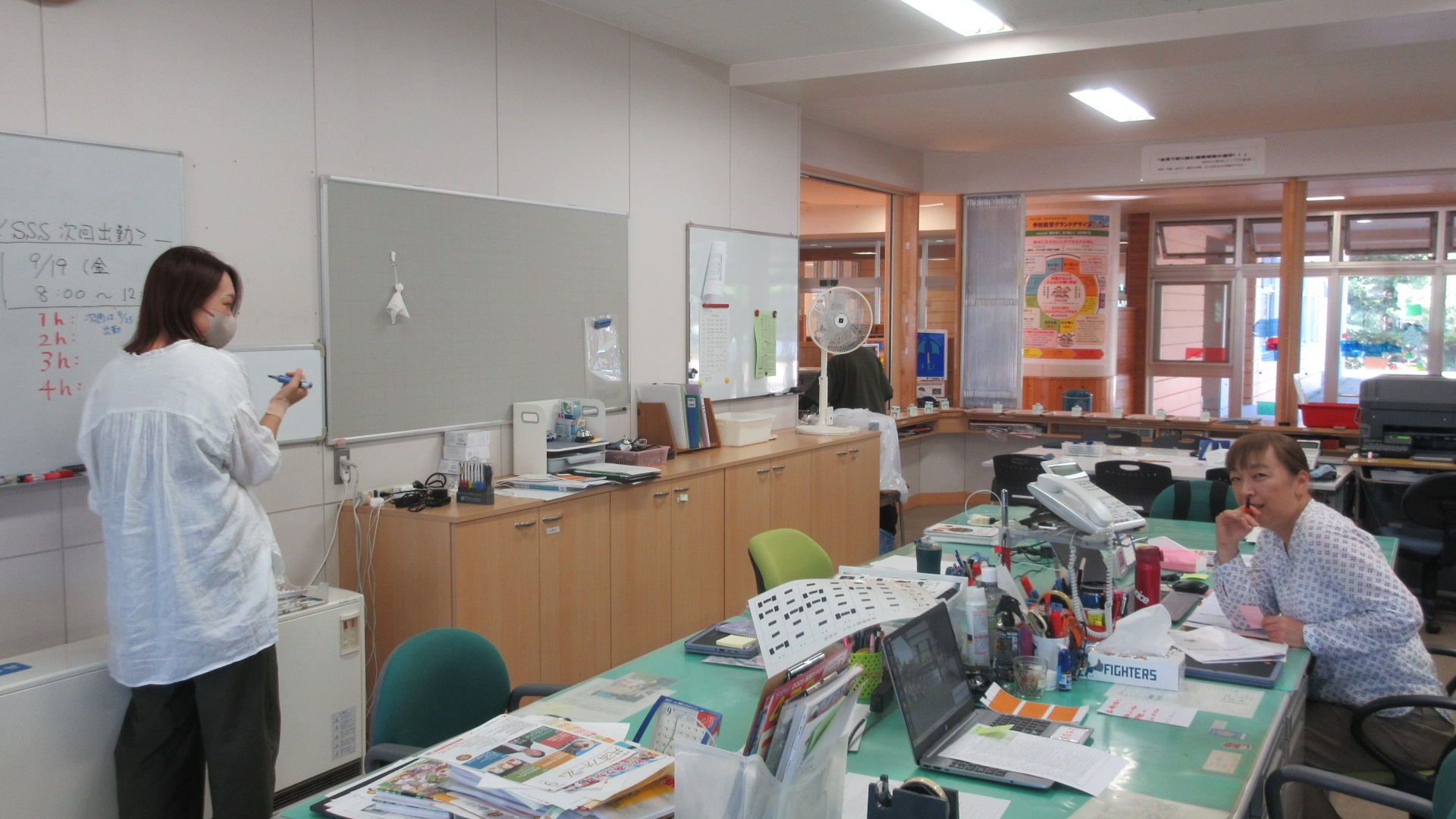 職員室のホワイトボードには、いつも教師から手伝ってほしいことが書かれています。また、スクール・サポート・スタッフ(以下SSS)からも連絡をしたり、先生と直接会話したりして助けてくれます。