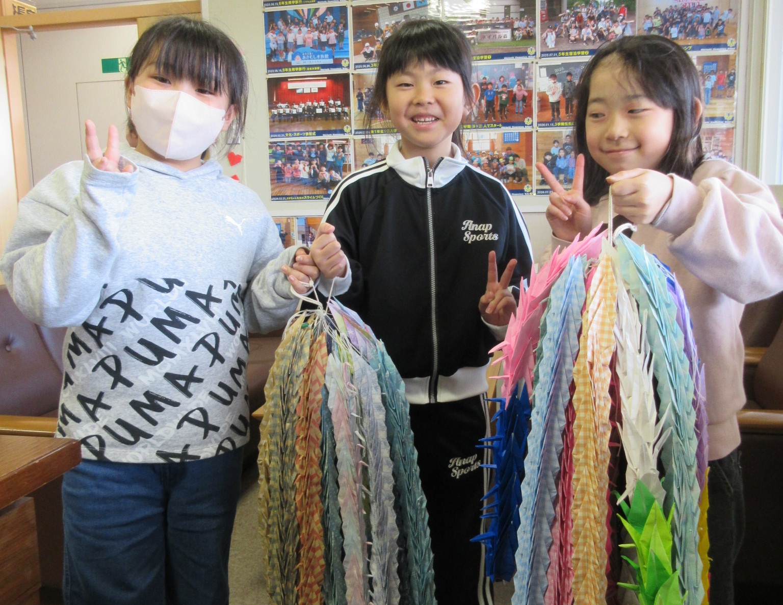 保健室に飾られている千羽鶴です。この3人が、知内小学校のみんながいつも元気いっぱい笑顔で過ごせるように、1つずつ根気強く作ったことが本当に素晴らしいです。まさしく「笑顔があふれ がんばりが輝く学校」ではないでしょうか。ありがとう!