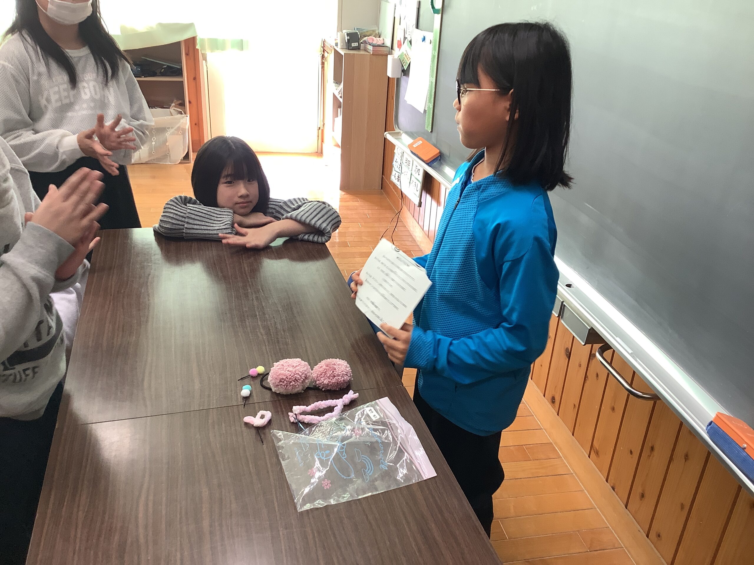 3年生の教室では、自由作品を作ってきた子の発表会で、冬休みの力作を発表していました。少人数ならでは、発表者のすぐそばで説明を真剣に聞いていました。