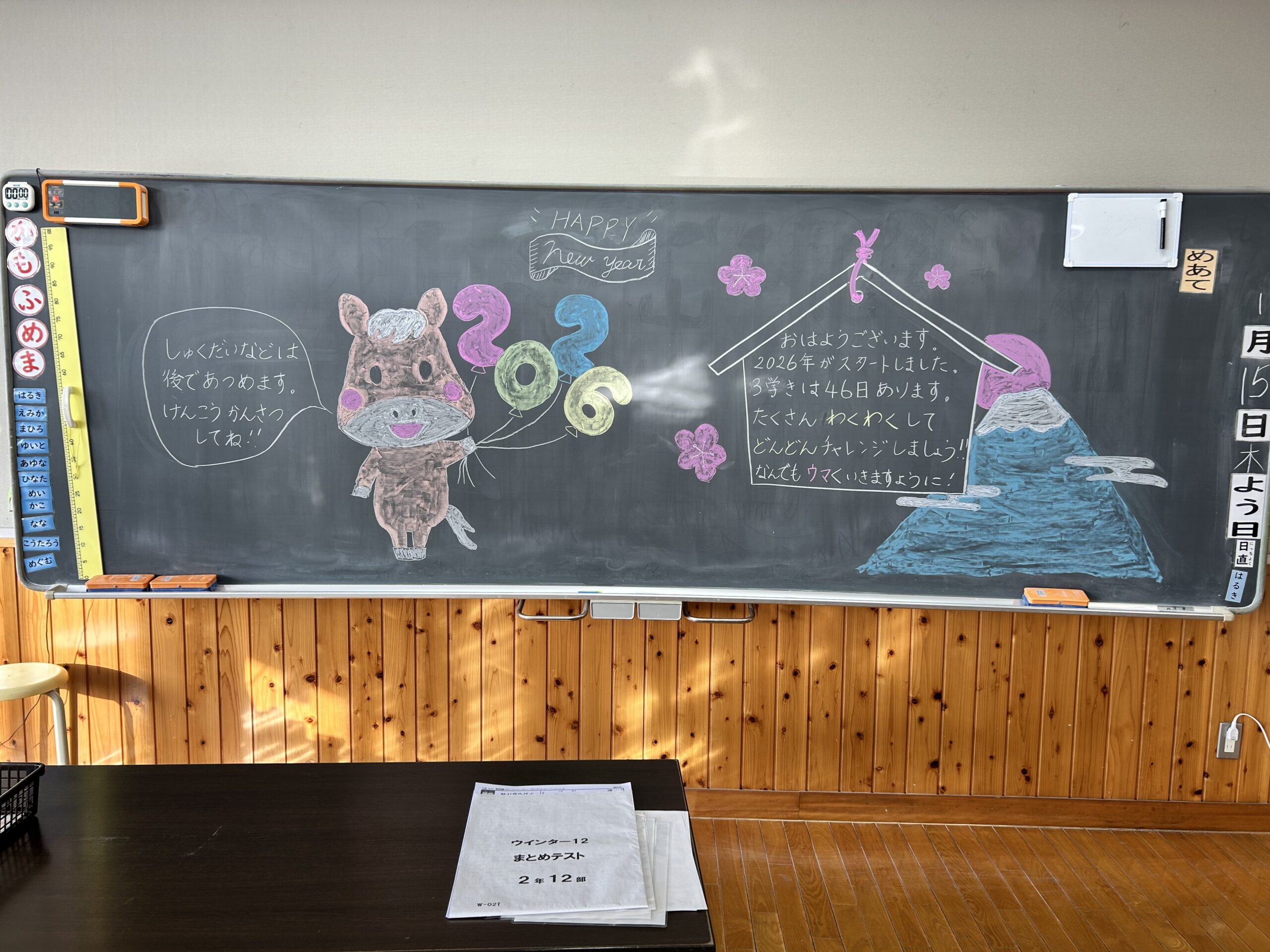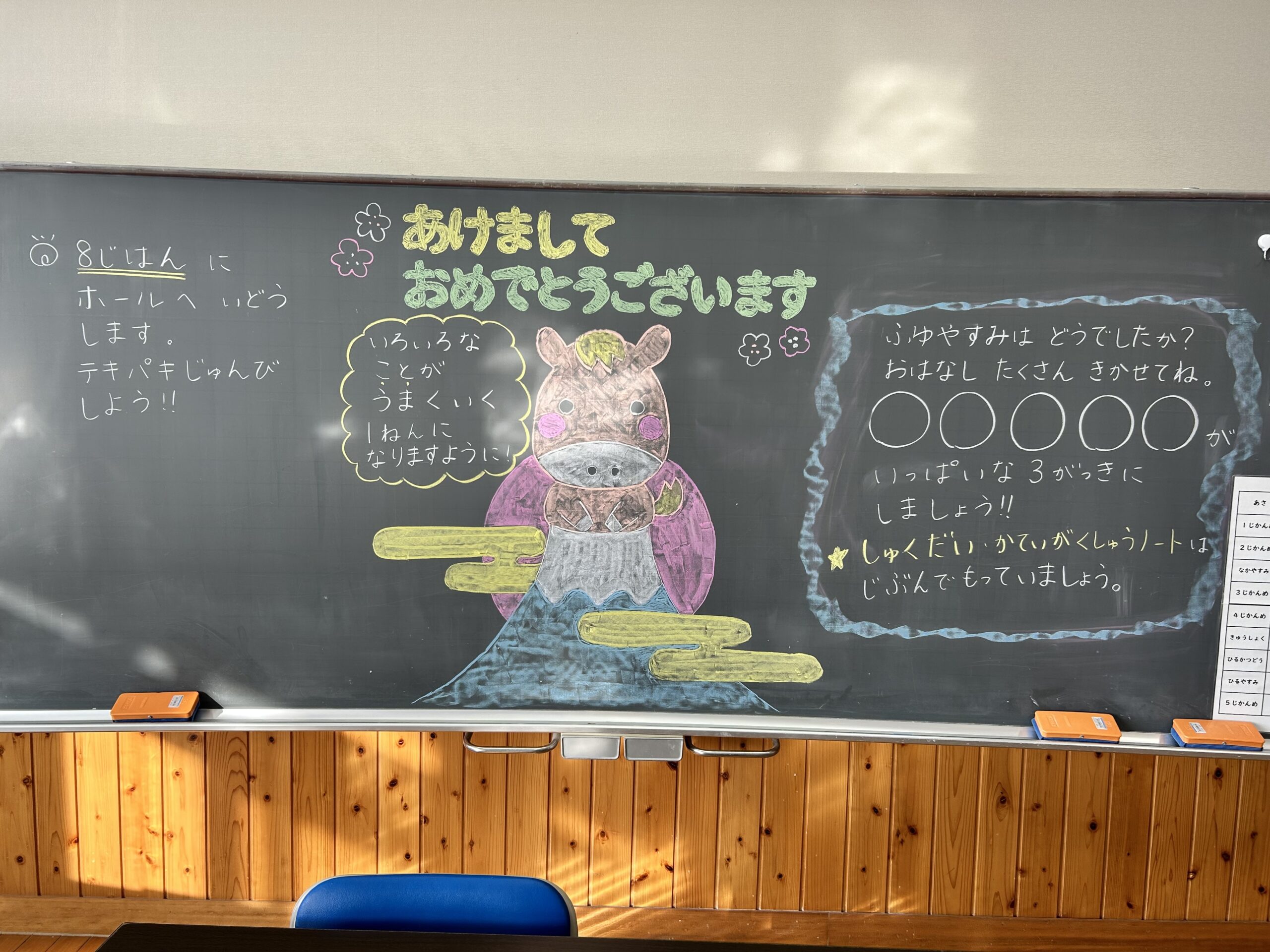 同様に2年生の教室にも、「たくさんわくわくして、どんどんチャレンジしましょう!なんでもうまくいきますように!」とともに午の絵が描かれていまし・・