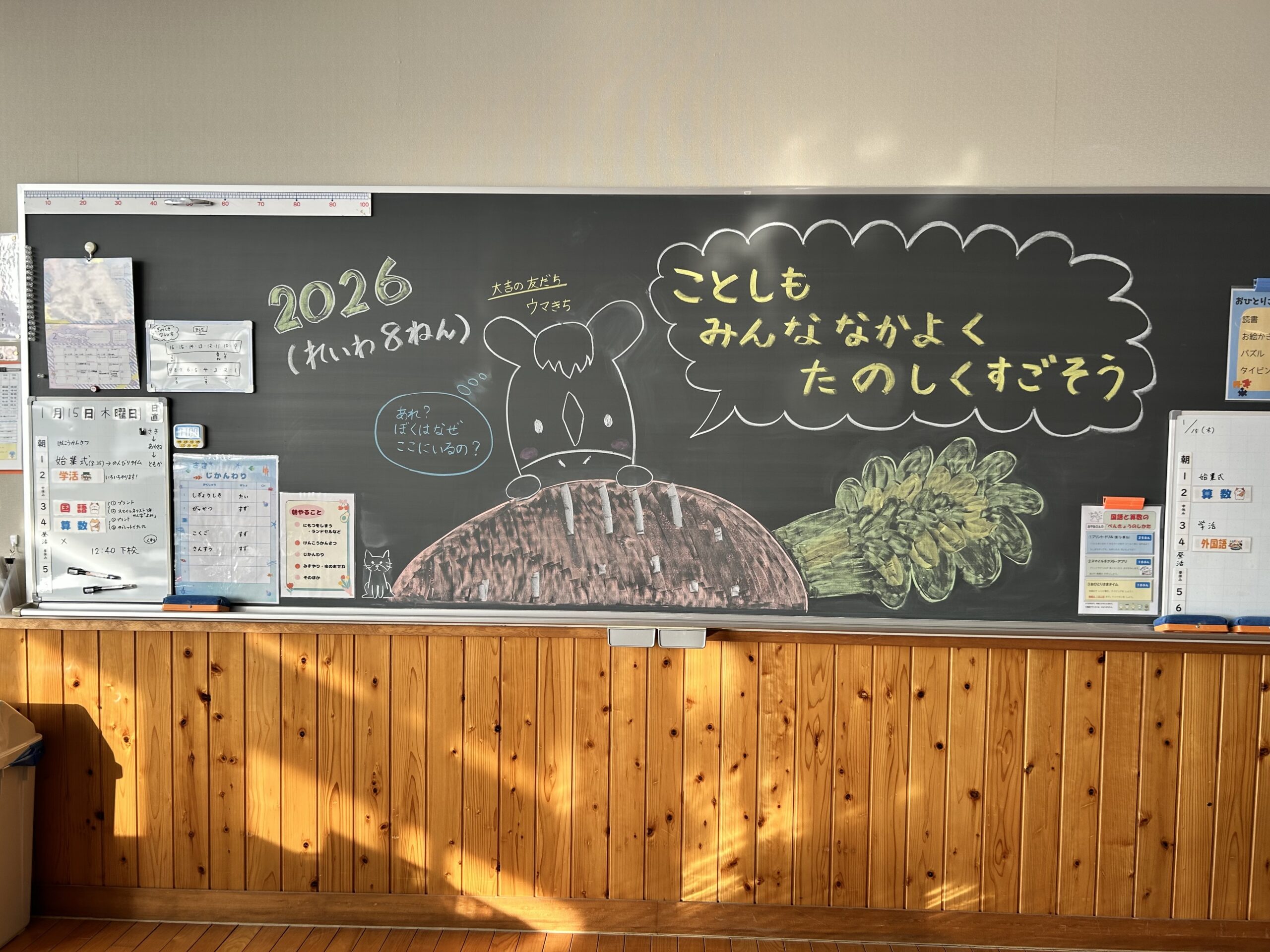 支援級の教室には、「ことしも みんななかよく たのしくすごそう」と、にんじんを食べている午が書かれていました。いつも始業式に先生のメッセージ入りの黒板を見るのが楽しみです。