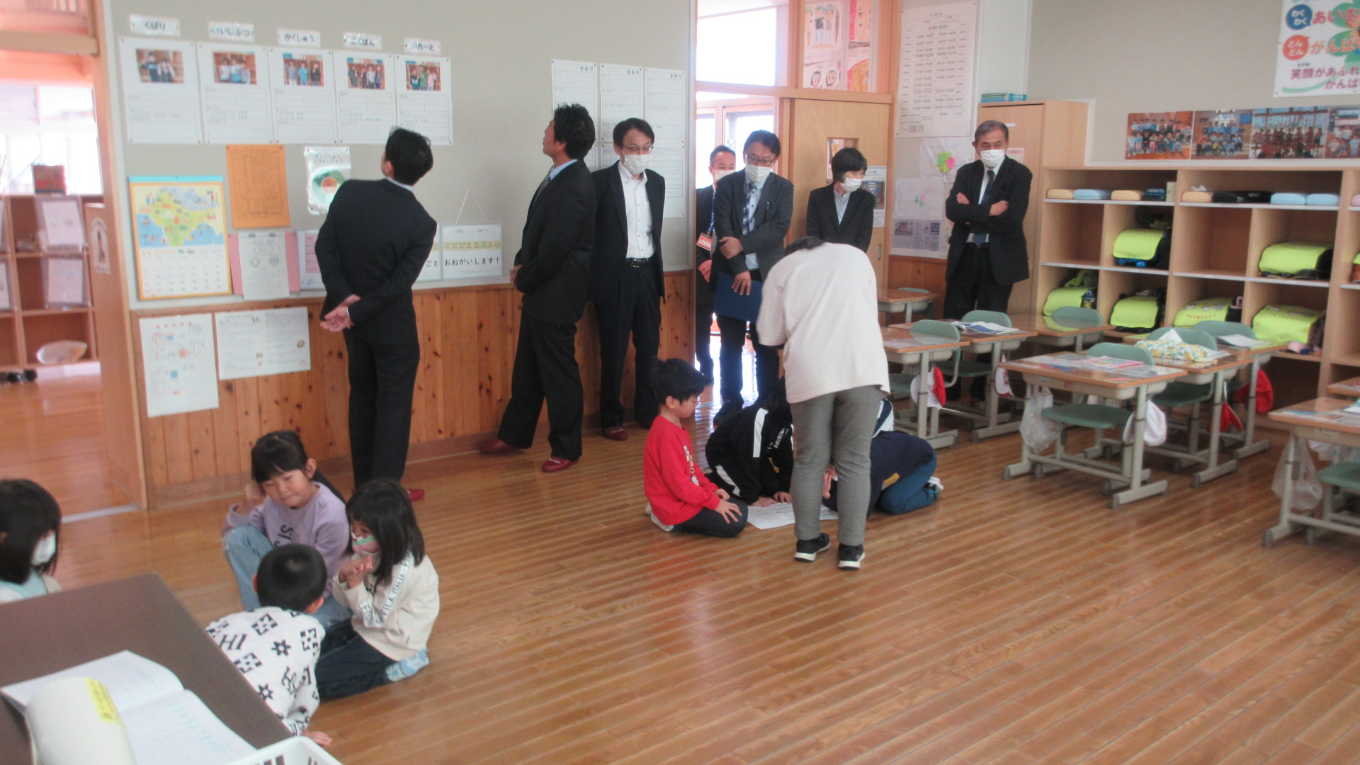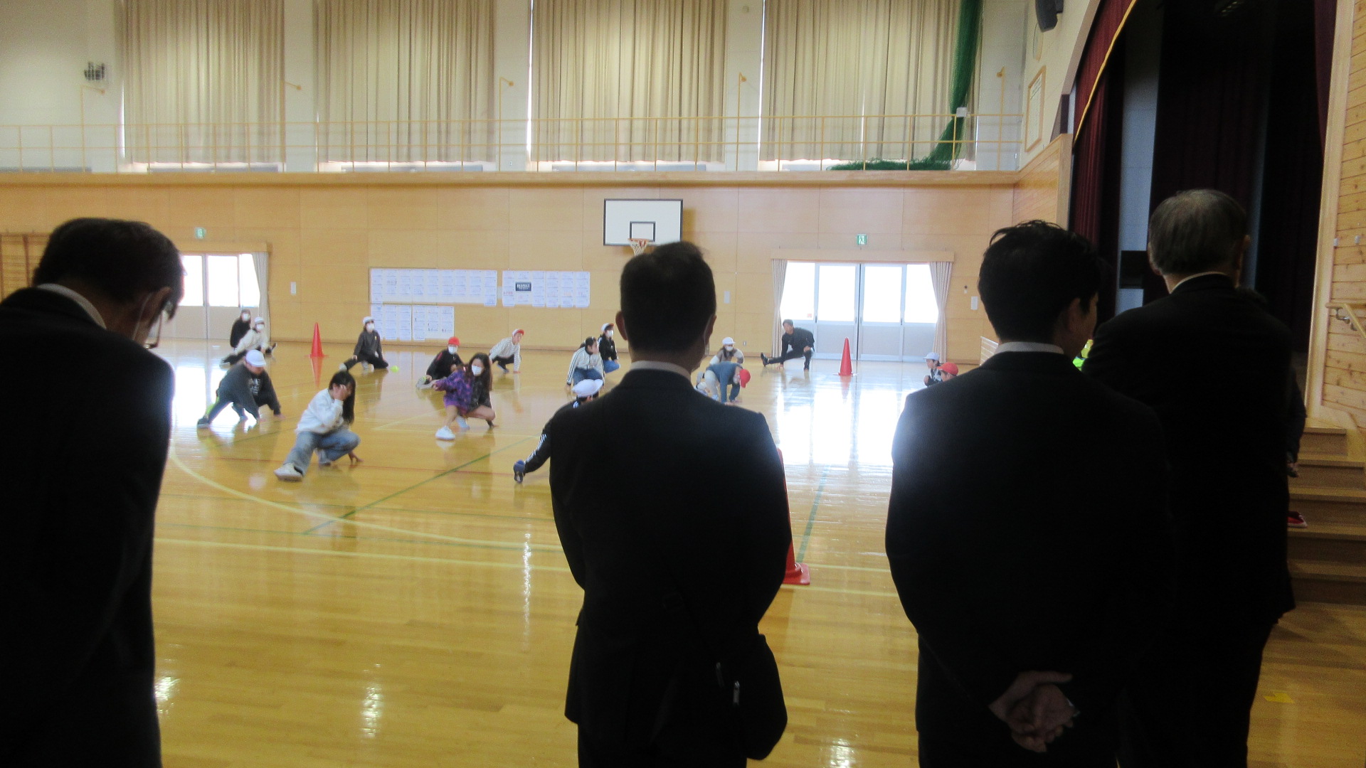 知内町の教育委員の皆様が教育視察に来てくださいました。校長室で、本校の教育について説明をした後、各学級の子どもたちの様子を見て回りました。5年生は体育の学習をしていました。ちょうど準備体操の所で、声を出しがんばっていました。