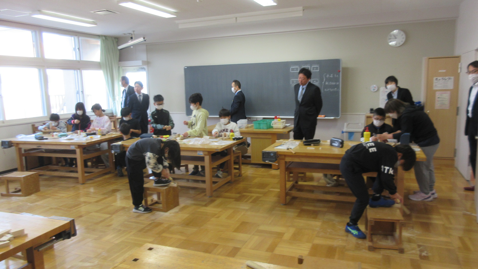 4年生は、図工の学習でした。「とんとんギコギコ」の「学習で、のこぎりや金づちを使って作品を作っていました。みんな自分が作りたいものをイメージ真剣に制作していました。教育委員の皆様も、がんばっている子どもたちの姿を見てとても喜んでいました。