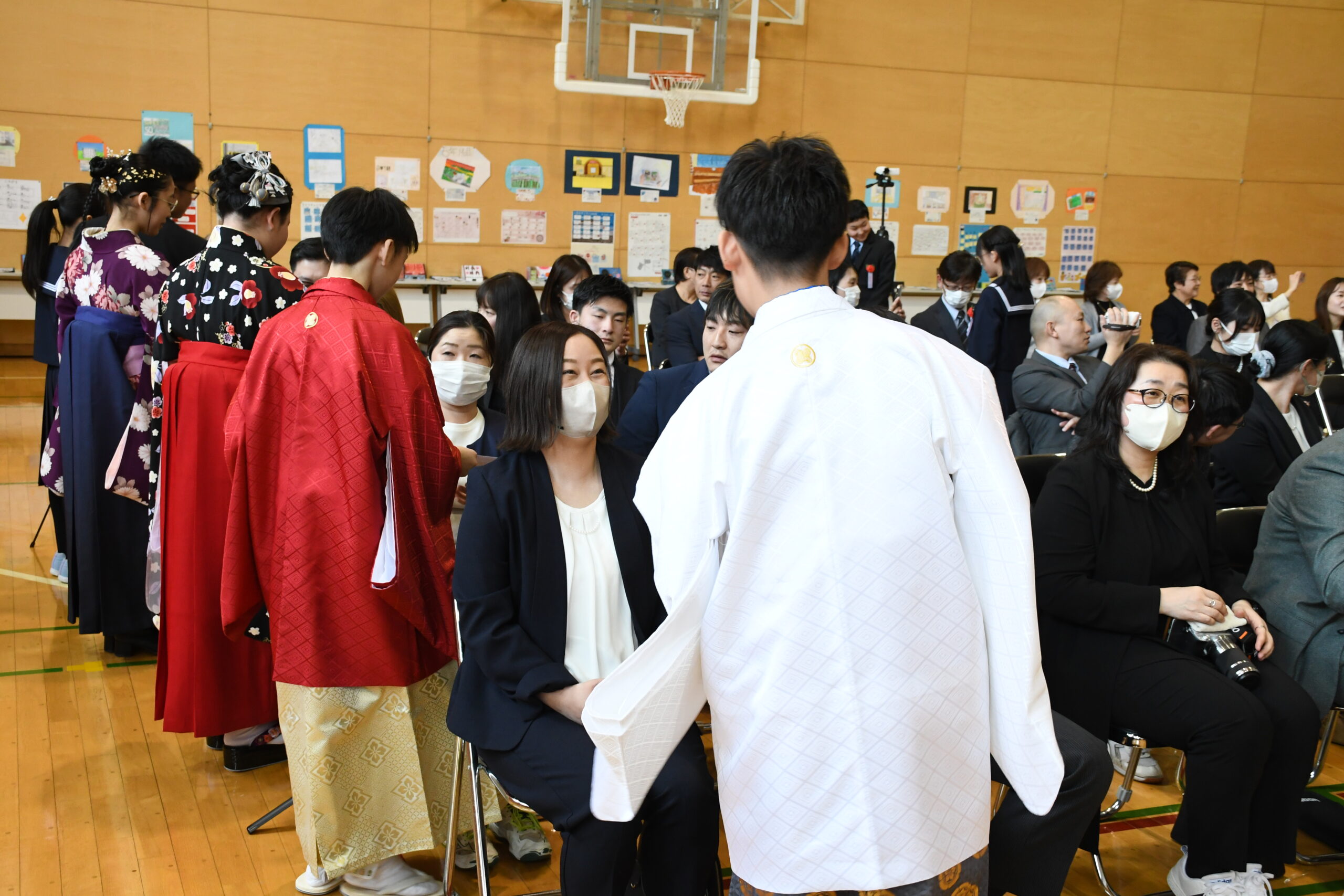 式歌が終わると、6年生は自分の家族の下へ・・・。感謝の手紙をサプライズプレゼントしました。