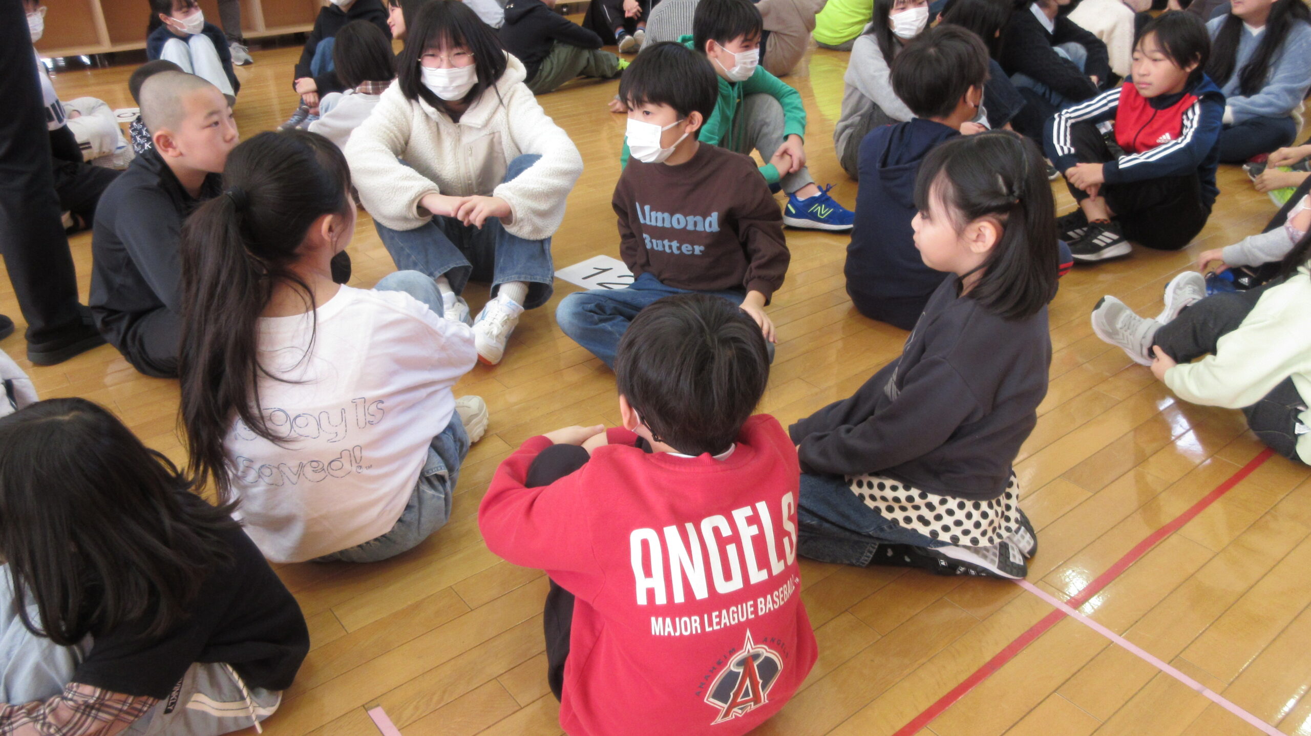始業式では、校長先生のお話の前段で「冬休みの思い出」について、縦割り班で交流する場面がありました。