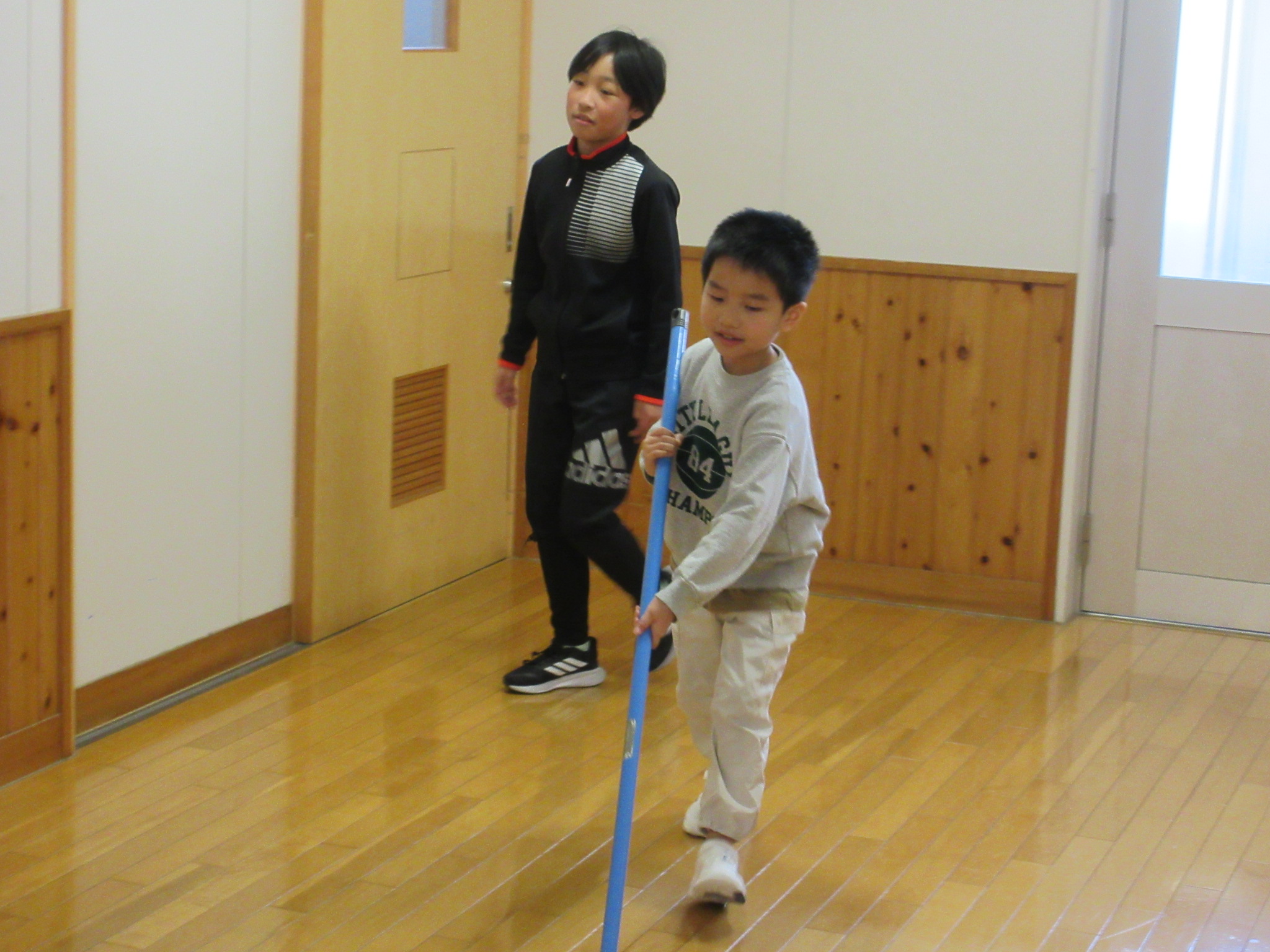 1年生は、リーダーの6年生に教わりながら掃除をしていました。